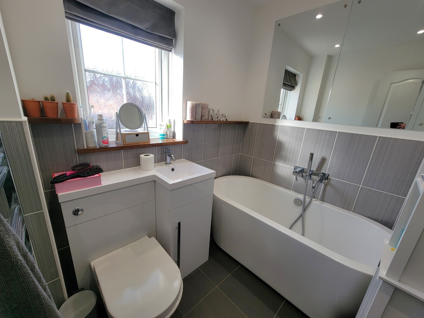 6' 7" x 5 ' 6" (2.01m x 1.68m) White suite comprises free standing bath with shower mixer tap, low level wc with concealed cistern and vanity unit inset wash hand basin with mixer tap and storage cupboard below, heated towel rail, half tiled walls, tiled floor, PVC double glazed window to the rear aspect.