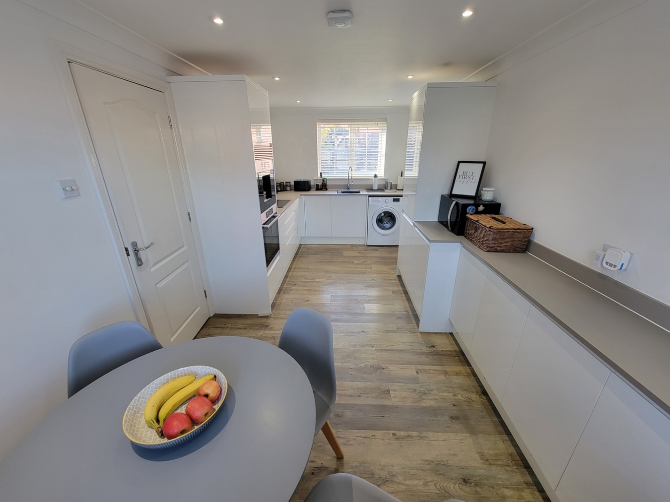 17' 9" x 8' 8" (5.41m x 2.64m) Fitted with a good range of base and wall mounted units having matching high gloss doors and drawer fronts, fitted worktops inset with stainless steel sink unit with mixer tap, four ring electric hob, extractor connected over, built-in dishwasher, fridge/freezer, eye level oven and coffee machine, space for washing machine, wood effect flooring, PVC double glazed windows to the front and rear aspects.
