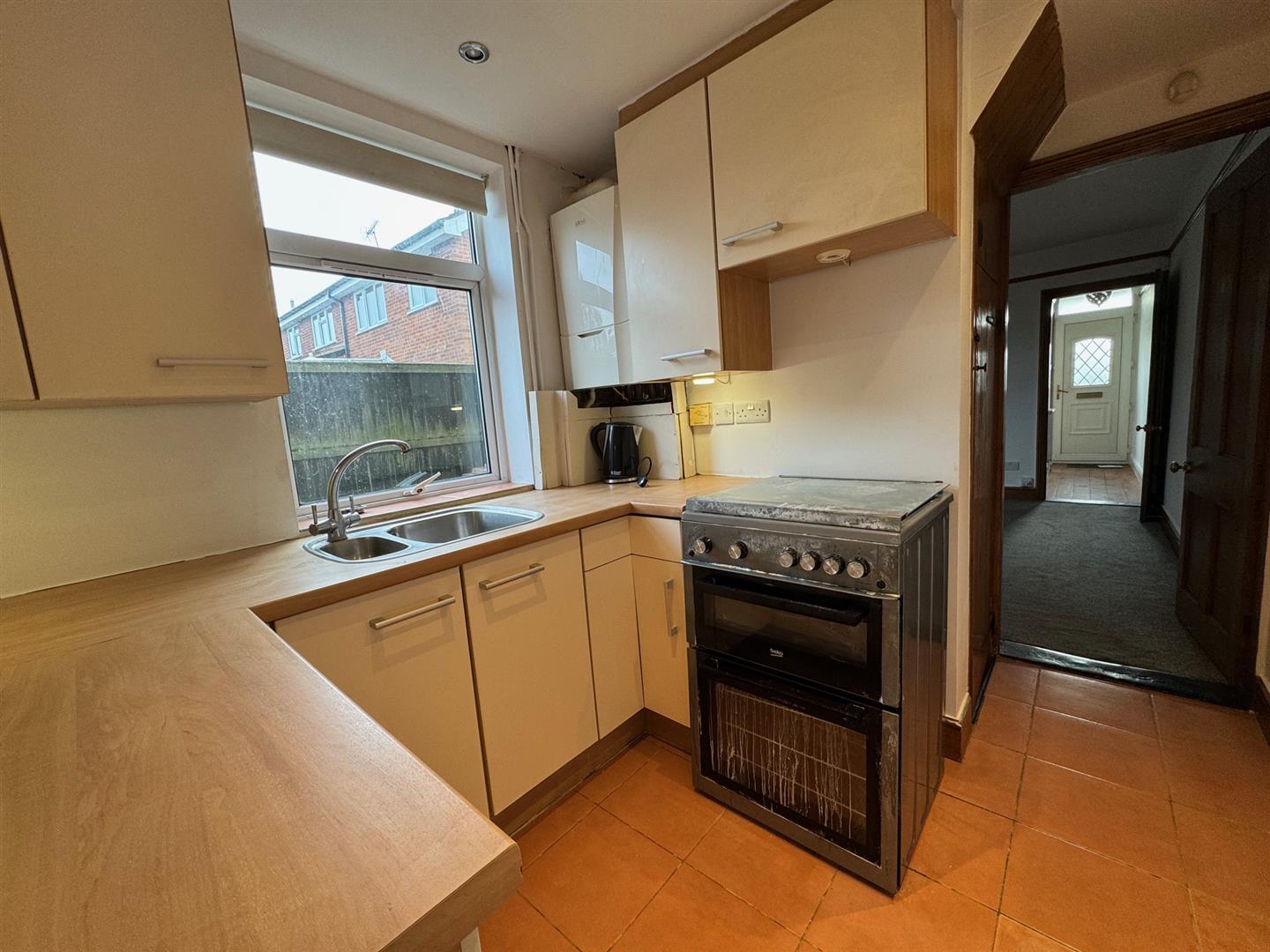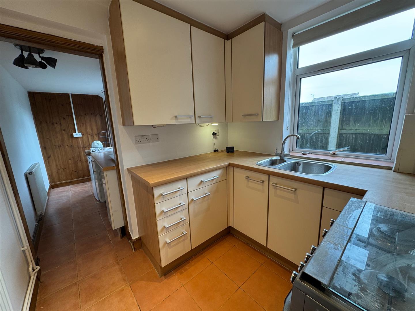 Double glazed window to side, range of wall and base units, drawers, sink and drainer, work tops, combi boiler, tiled floor, through to...