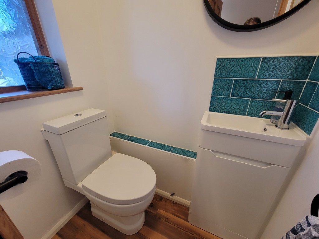 CLOAKROOM: Re-fitted suite comprises low level wc and vanity unit with inset wash hand basin, mono mixer tap and storage cupboard below, attractive wall tiling wood effect flooring, window to the front aspect.