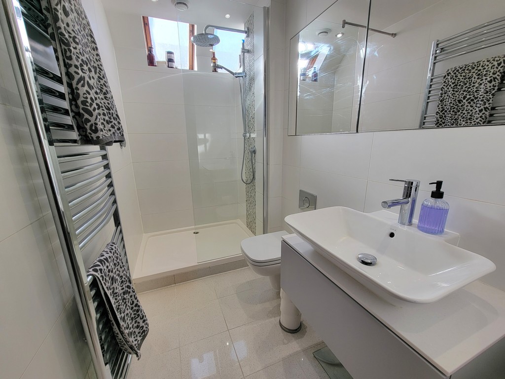FAMILY SHOWER ROOM: 10' 7" x 5 ' 0" (3.23m x 1.52m) High quality fittings by Anglia Factors incorporate a large walk-in independent shower enclosure with fixed glazed screen, low level wc with concealed cistern, large vanity unit with inset ceramic wash hand basin, mono mixer tap and storage drawers drawer below, secret built-in shelved storage cupboards with opening mirrored doors, inset spotlights, extractor fan, chrome towel radiator, high gloss wall and floor tiling.