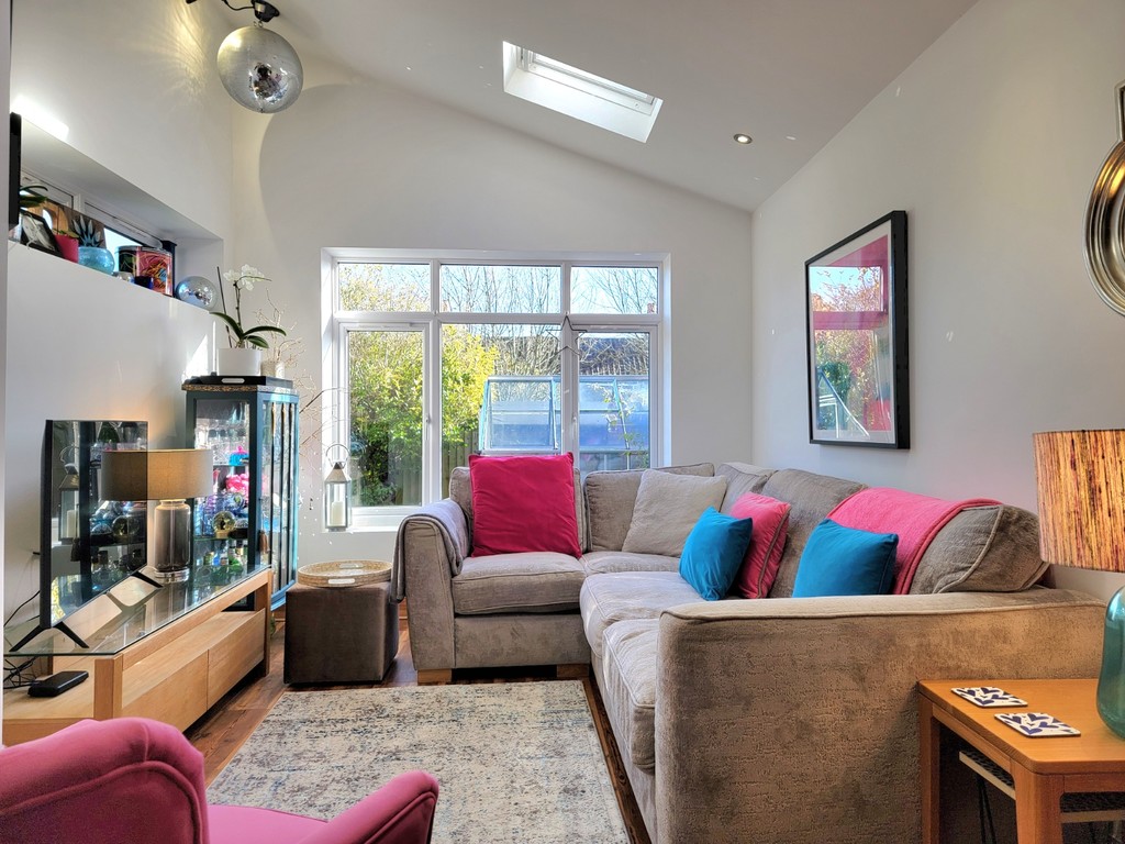 GARDEN ROOM: 12' 7" x 9' 7" (3.84m x 2.92m) 10' high vaulted ceiling, wood effect flooring, inset spotlights, two Velux roof lights, high level window, large screen style window overlooking the garden.