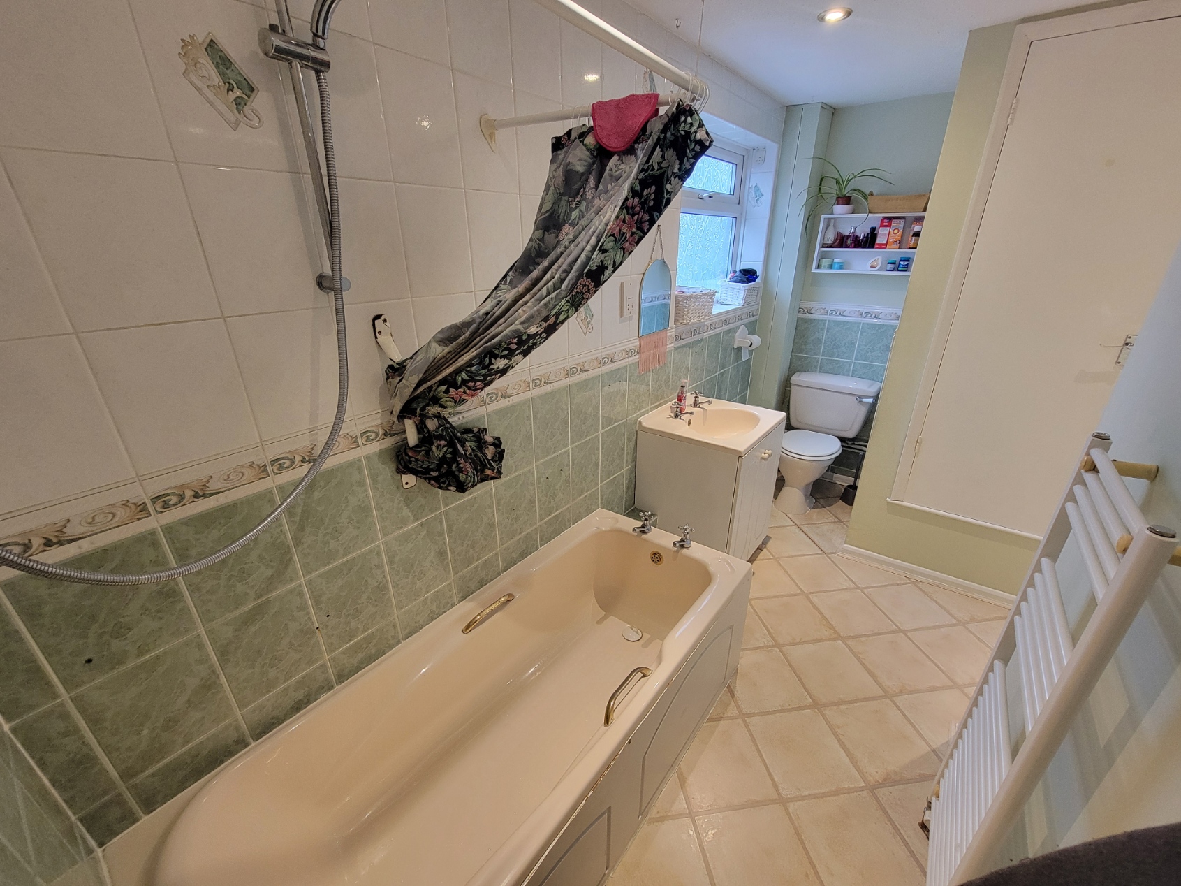 Modern white suite comprises low level wc, panel bath with shower connected over and vanity unit with inset wash hand basin and storage cupboards below, generous built-in overstairs storage cupboard, inset spotlights, extensive wall and floor tiling, PVC double glazed window to the side aspect.