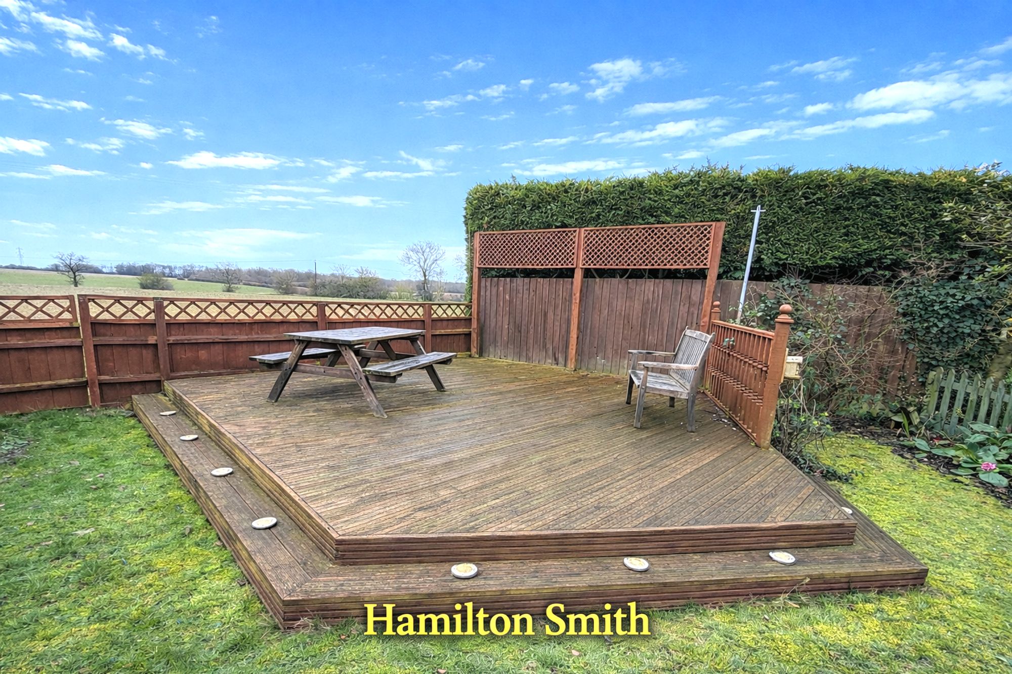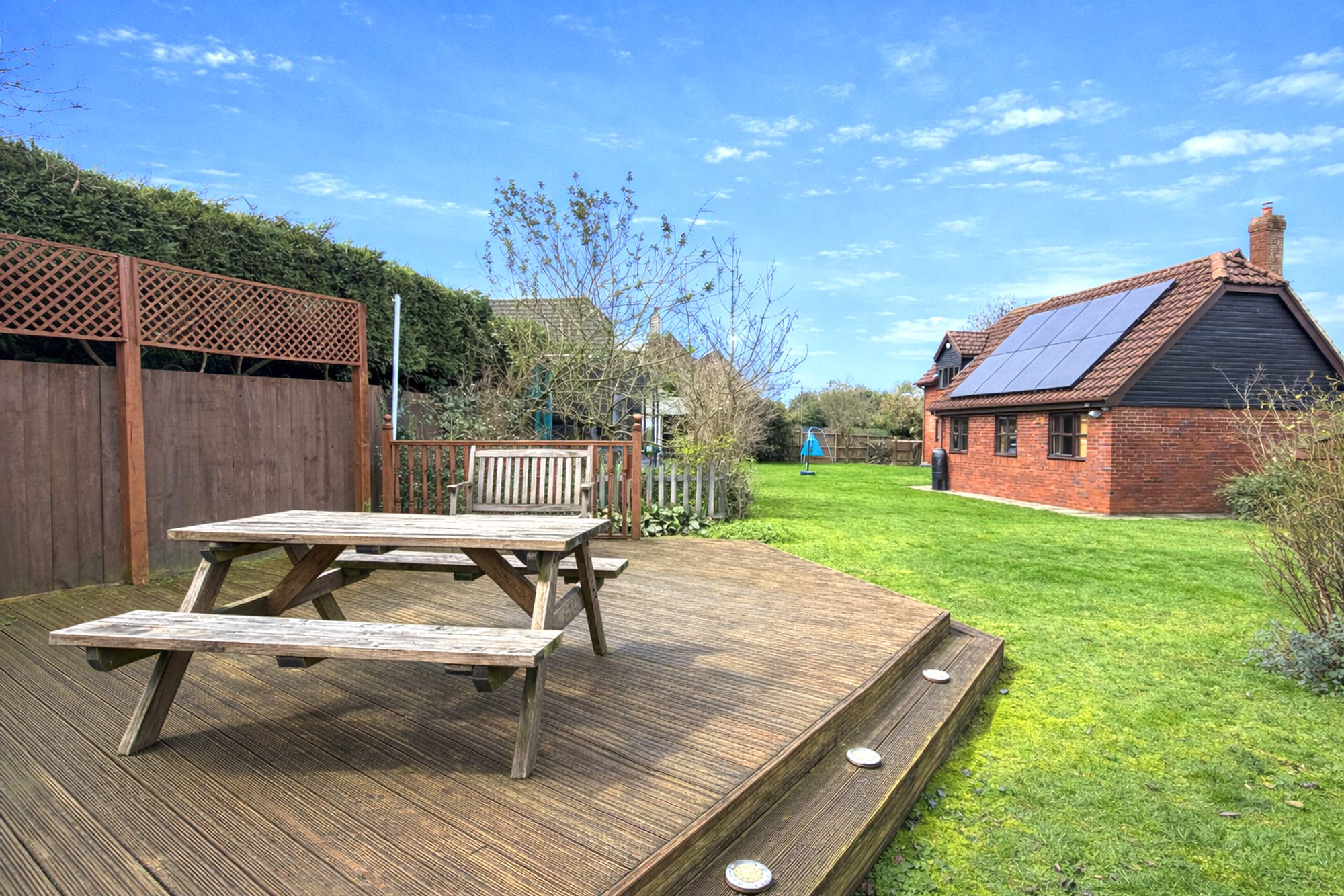 To the rear, a generously proportioned, fully enclosed garden is predominantly laid to lawn. A raised decked terrace provides the perfect setting for outdoor entertaining, all while enjoying uninterrupted views across open fields.