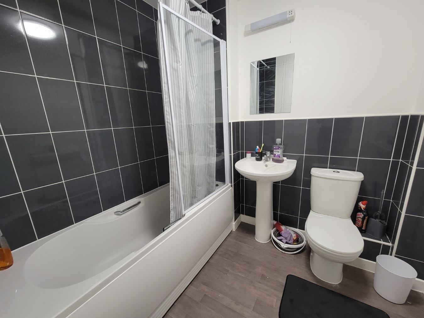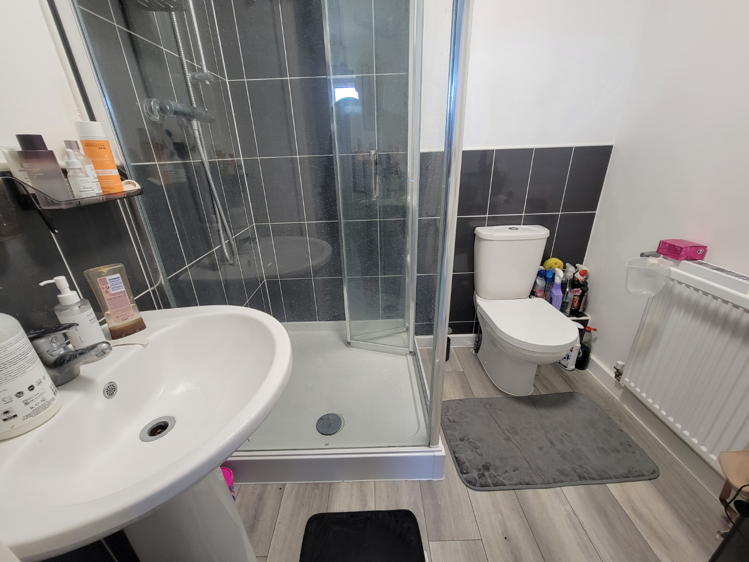 Modern suite comprises low level wc and pedestal wash hand basin, extractor fan, radiator, wood effect flooring.