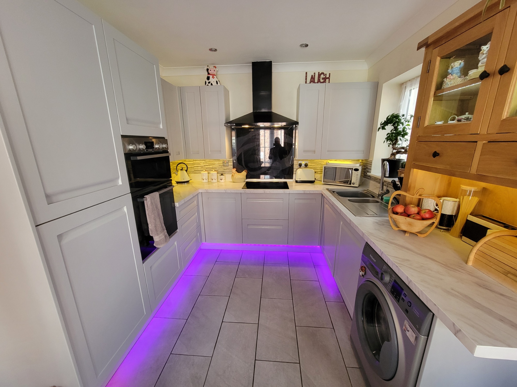 Kitchen/dining room: 13' 7" x 9' 8" (4.14m x 2.95m) Fitted with a good range of contemporary styled base and wall mounted units, marble effect fitted worktops inset with one and a half bowl stainless steel sink unit with mixer tap, inset black glass ceramic hob with black glass splash back, extractor fan connected over, integrated eye level stainless steel and glass double oven and grill, integrated fridge/freezer, plumbing for washing machine, inset spotlights, tiled floor, PVC double glazed windows to the front and rear aspect overlooking the garden, PVC double glazed French doors opening to the conservatory.
