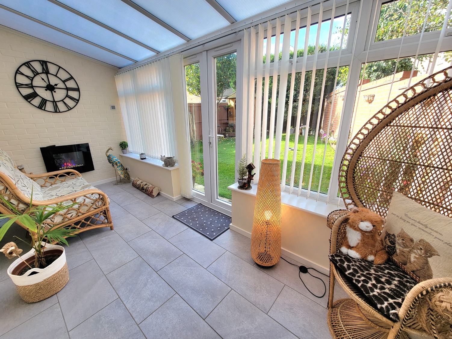 Conservatory: 15' 6" x 6' 4" (4.72m x 1.93m) PVC double glazed construction, tiled floor, wall mounted flame effect electric fire, PVC double glazed French doors opening to the garden