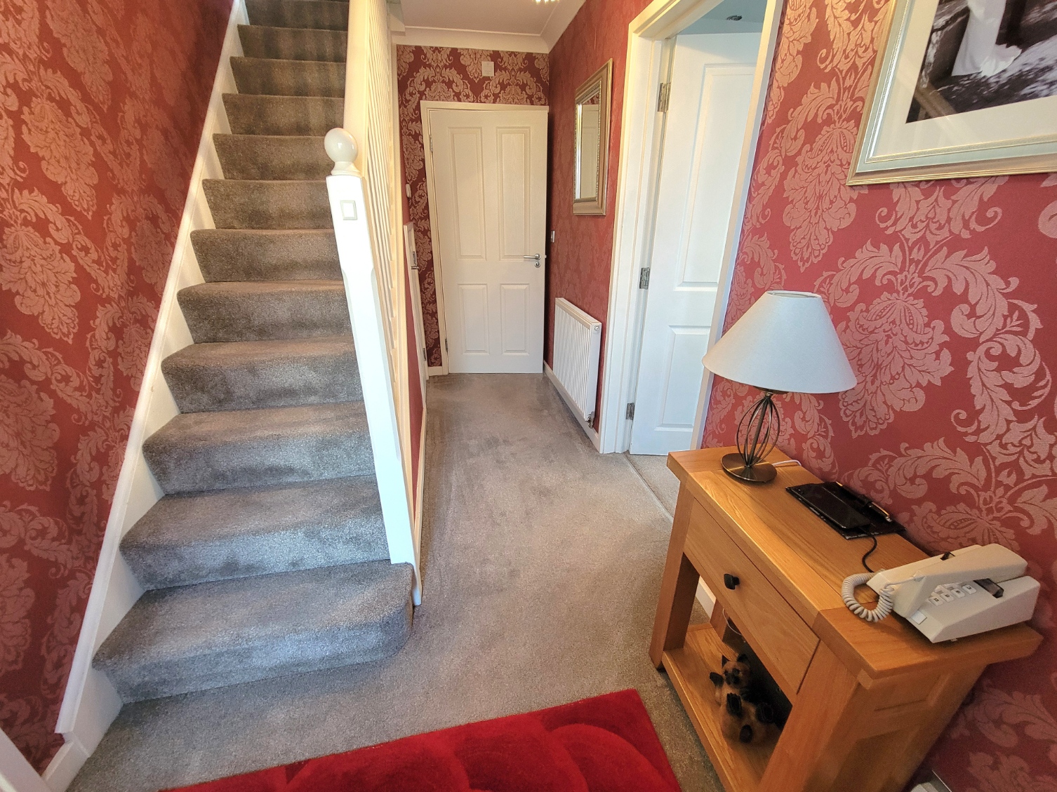 Reception hall: 12' 9" x 6' 4" (3.89m x 1.93m) Half glazed PVC entrance door, built-in understairs storage cupboard, radiator.