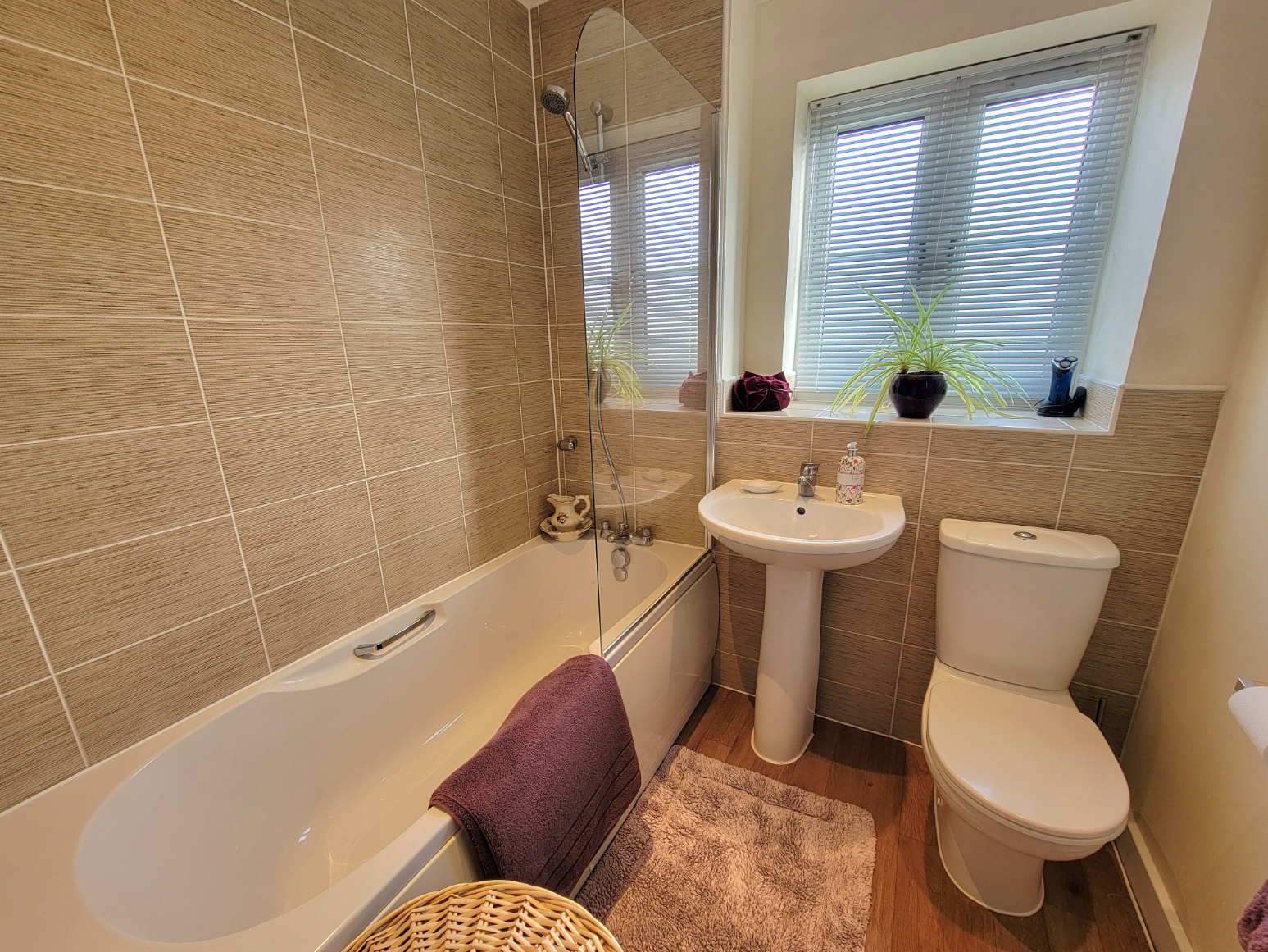 Family bathroom: Suite comprises low level wc, pedestal wash hand basin and panel bath with shower connected over and pivot glazed screen, extensive stone effect wall tiling, towel radiator, inset spotlights, PVC double glazed window to the rear aspect.