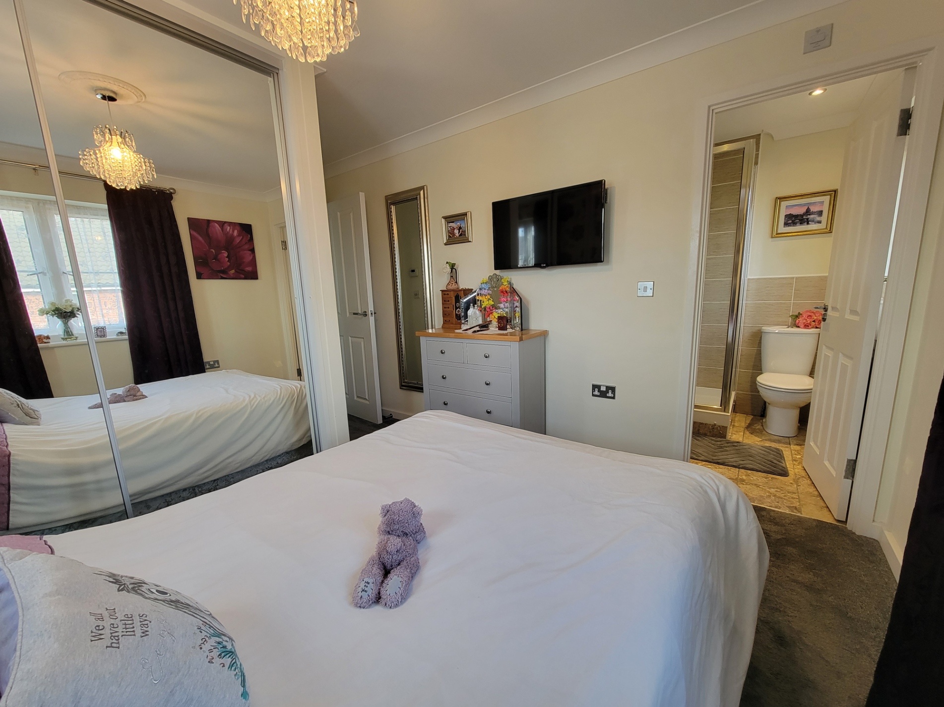 En-suite: 5' 5" x 4' 7" (1.65m x 1.4m) White suite comprises low level wc, independent shower enclosure with glazed screen and vanity unit with inset wash hand basin, mono mixer tap and storage cupboard below, tiled floor, stone effect wall tiling, chrome towel radiator, PVC double glazed window to the front aspect.