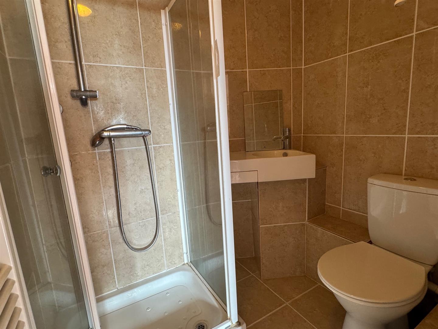 With a shower cubicle, hand wash basin, W.C, extractor, ladder towel radiator and tiled.