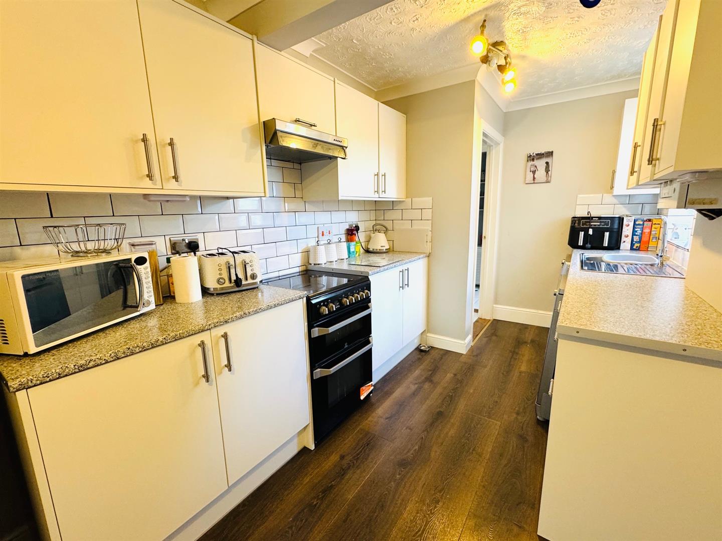 Kitchen: 8'6 x 7'6 - (2.59m x 2.29m)- Double glazed window to side, wall and base units, sink and drainer, worktops, tiled splash backs, cooker with extractor over, space for appliances, spot lightsthrough to...