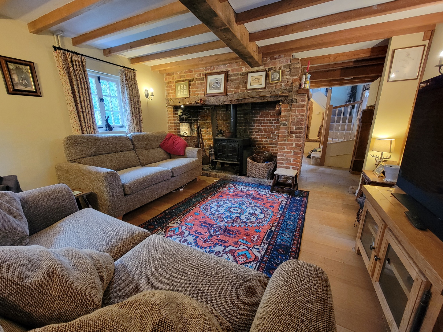 Sitting room: 25' 0" x 13' 4" (7.62m x 4.06m) Feature massive red brick inglenook fireplace with bressummer beam over, brick hearth, inset wood burning stove, solid oak wide board flooring, exposed ceiling timbers, radiator, double aspect with windows to the front and rear aspects overlooking the garden, oak stable door opens to the rear garden.