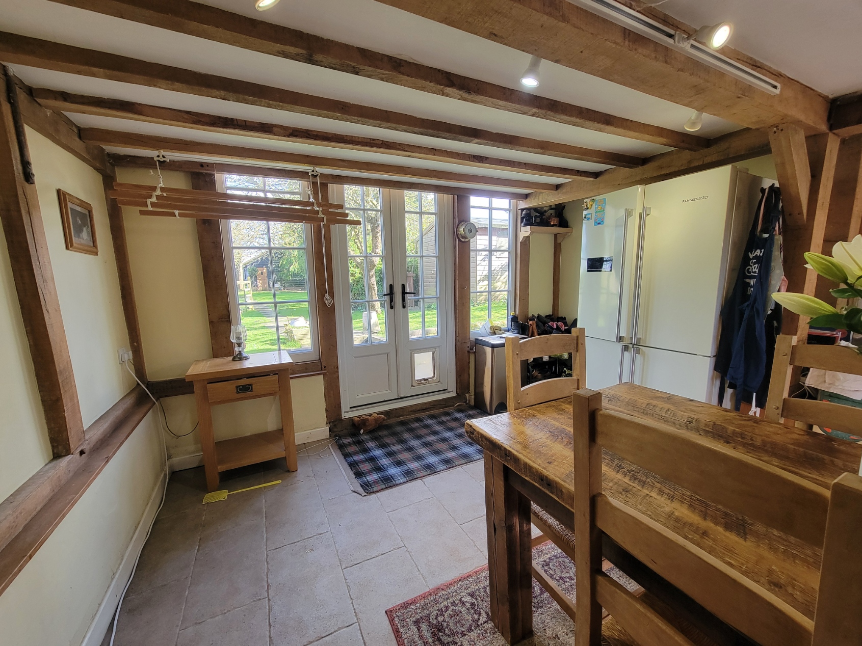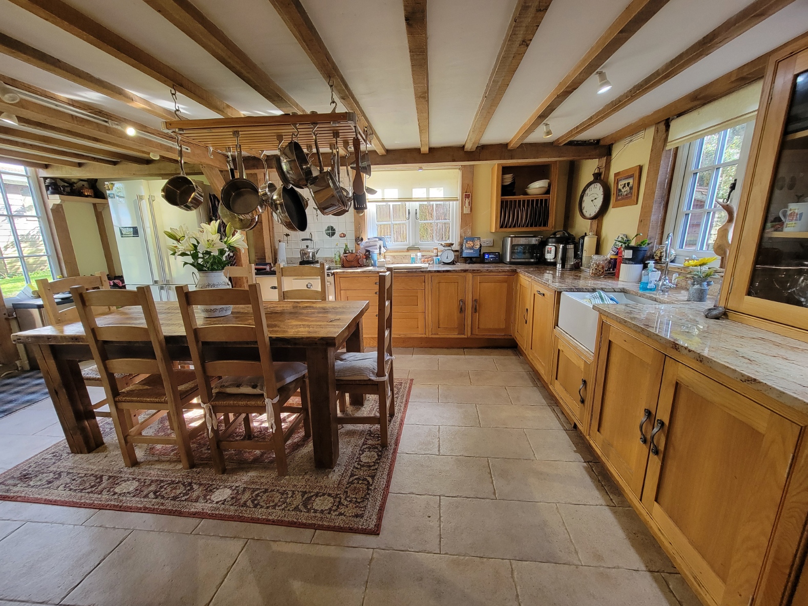 Kitchen/dining/living room: 19' 0" x 13' 4 " (5.79m x 4.06m) A beautiful room fitted with an extensive range of handmade oak cabinetry including wide pan drawers and storage cupboards and plate rack, integrated dishwasher, large built-in double door shelved larder cupboard, solid granite worktops with upstand inset ceramic butler sink with chrome mixer tap, two oven Esse gas fired range cooker, decorative tiled splashback, extensive wall and ceiling timbers, stone tiled floor with underfloor heating, windows to the front and side aspects, PVC double glazed French doors and windows overlooking the rear garden.