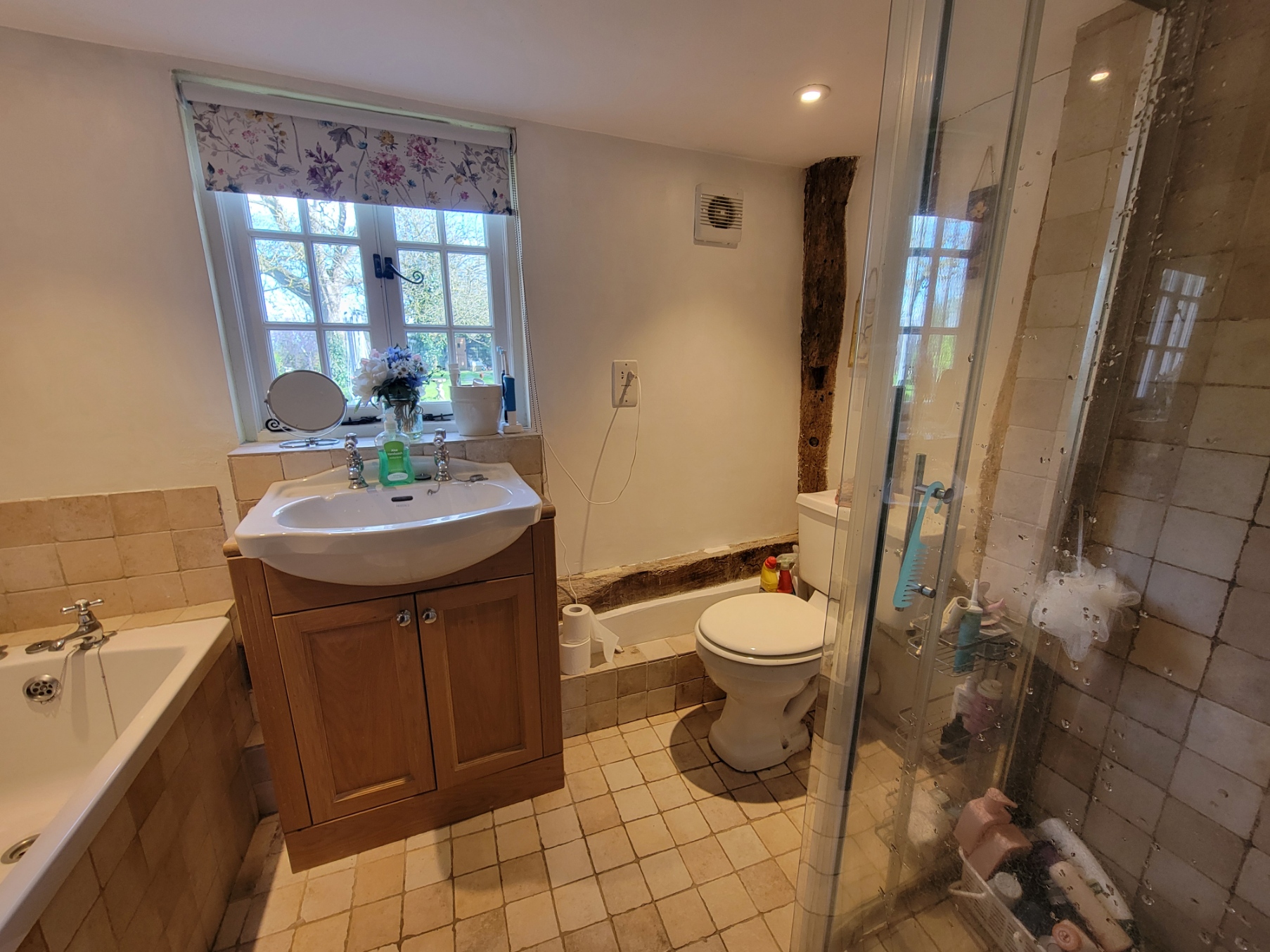 Bathroom: Suite comprises oak vanity unit inset ceramic wash hand basin with with storage cupboards below, bath with tiled panel, independent shower enclosure with glazed screen and low level wc, tiled floor with underfloor heating, inset spotlights, exposed oak timbers, window overlooking the rear garden.