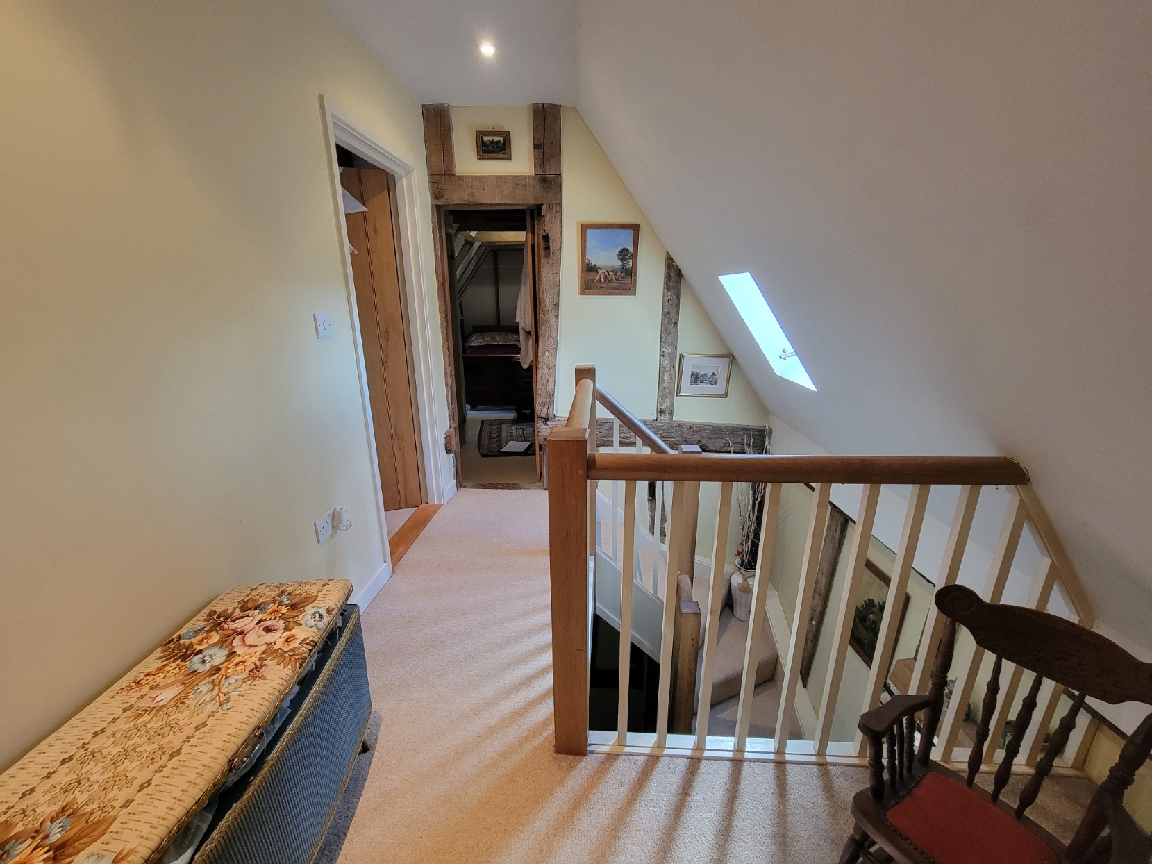 First floor galleried landing: Decorative balustrading, exposed timbers, inset spotlights, solid oak ledge and brace doors, heritage roof light to the front aspect.