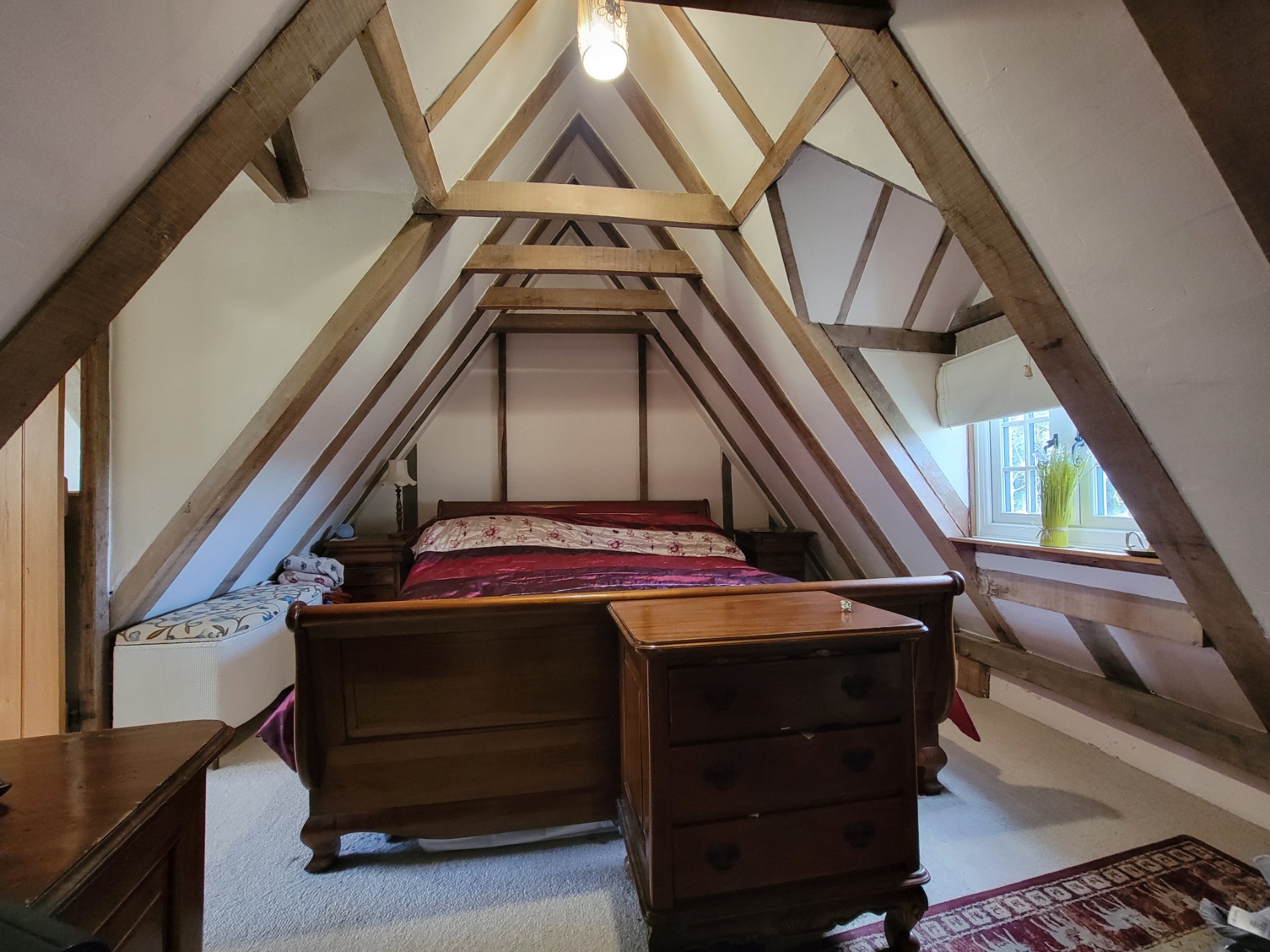 Master bedroom: 16' 9" x 12' 8" (5.11m x 3.86m) An atmospheric room with heavily exposed timbers and vaulted ceiling, built-in wardrobe, dormer window to the front aspect.