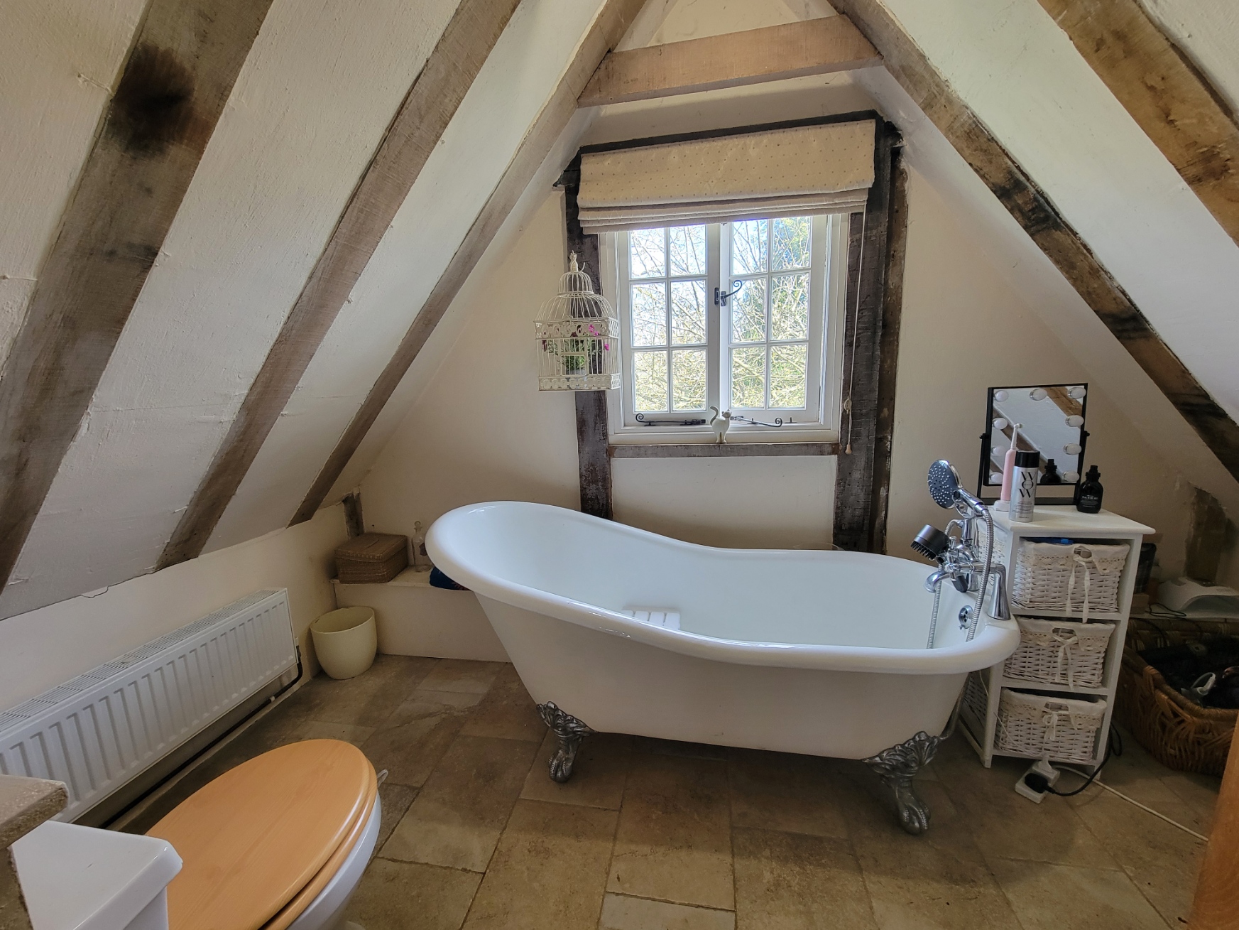 En-suite: Period style suite comprises low level wc, pedestal wash hand basin and freestanding ball and claw skipper bath with traditional style mixer tap, radiator, vaulted ceiling with exposed timbers, window to the rear aspect overlooking the garden.