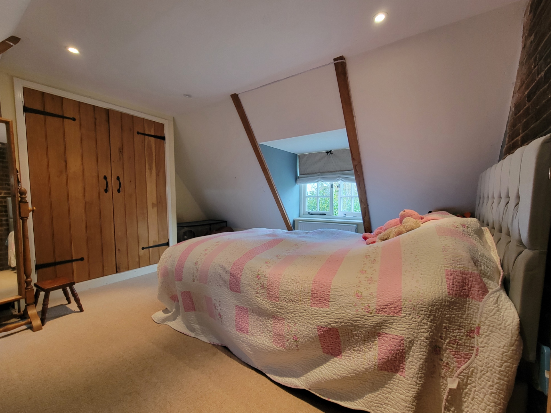 Bedroom 2: 12' 8" x 12' 8" (3.86m x 3.86m) Radiator, generous built-in double wardrobe with solid oak oak ledge and brace doors inset fitted shelves and hanging rails, inset spotlights, exposed chimney breast, dormer windows to the front and rear aspects with views over the garden.