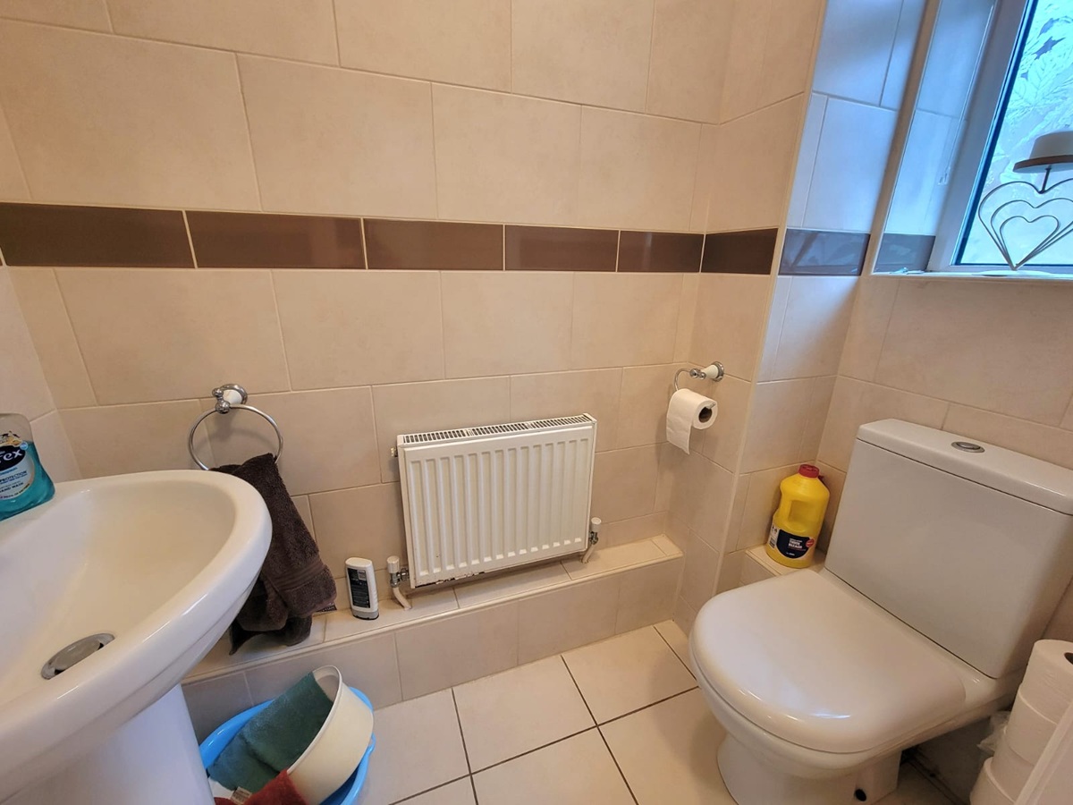 Modern white suite comprises low level wc and pedestal wash hand basin, radiator, fully tiled walls, tiled floor, PVC double glazed window to the front aspect.