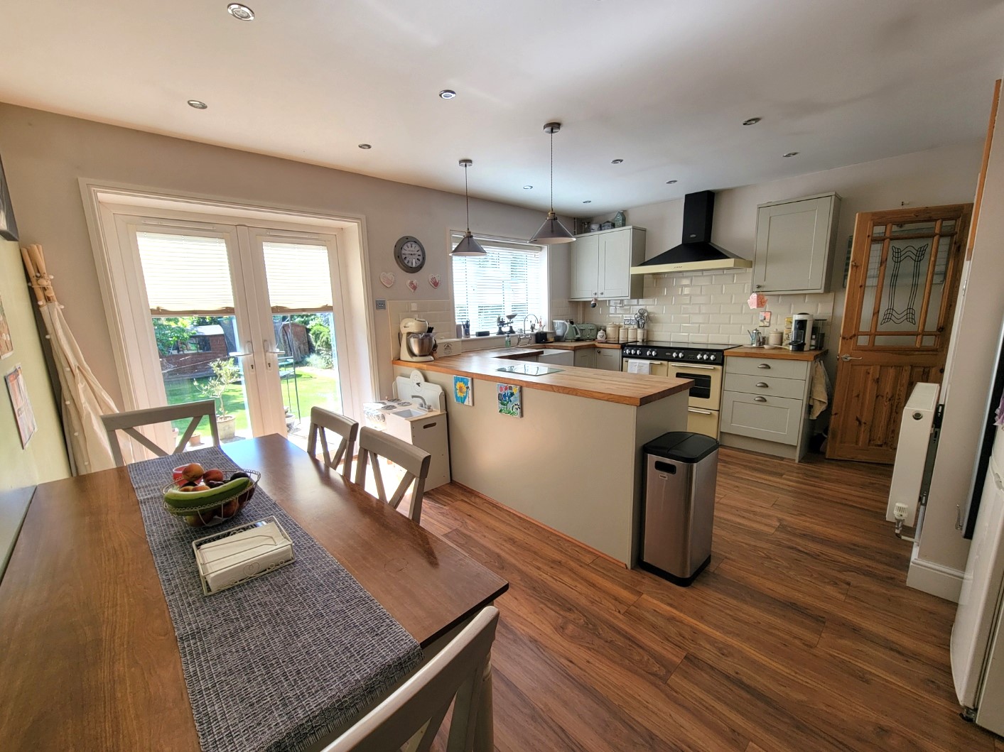 17' 0" x 13' 5" (5.18m x 4.09m) An impressive room with generous range of base and wall mounted units having panelled shaker style doors and drawer fronts, thick solid wood worktop, inset ceramic butler style sink unit with mixer tap, space for range cooker, large extractor fan connected over, integrated dishwasher, wood effect flooring, inset spotlights, PVC window and wide French doors opening to the garden.