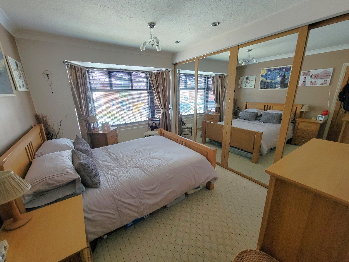 13' 9" x 12' 3 " (4.19m x 3.73m) Radiator, extensive range of built-in wardrobes with large sliding mirrored doors inset with fitted shelves and hanging rails, inset spotlights, Feature PVC window to the front aspect.