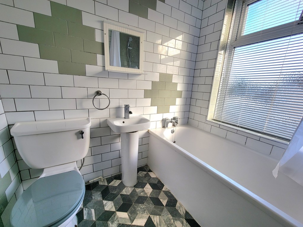 FAMILY BATHROOM: Modern white suite comprises panel bath with mixer tap, separate shower connected over, low level wc and ceramic pedestal wash hand basin with mono mixer tap, extensive wall tiling with feature panels, radiator, extractor fan, geometric style flooring, PVC triple glazed window to the front aspect.