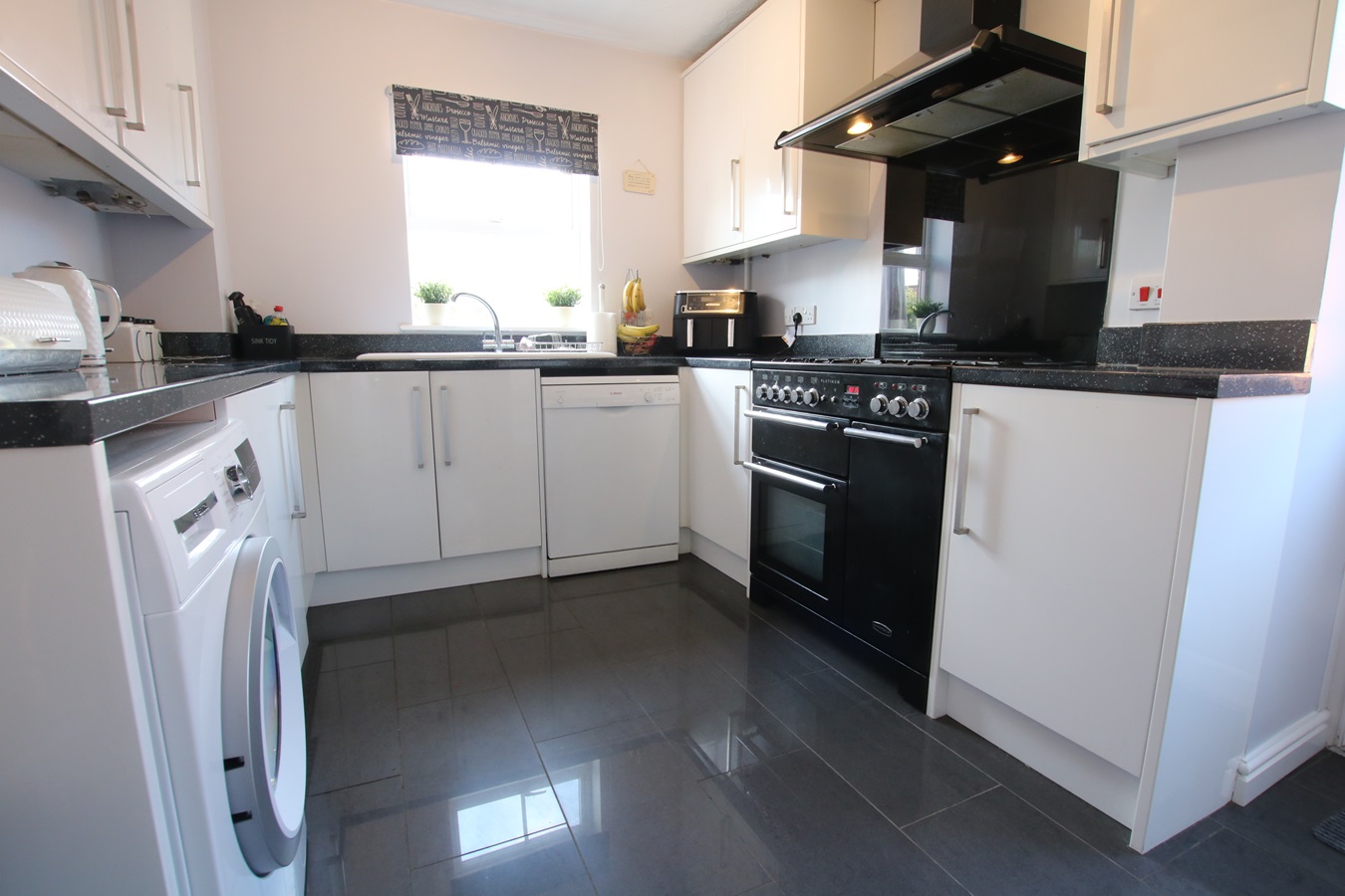 Kitchen: 13' 2" x 8' 10" (4.01m x 2.69m) Recently re-fitted with a good range of contemporary style white gloss base and wall mounted units, fitted worktops inset with ceramic sink with mono mixer tap, range cooker space with black glass back, large extractor connected over, plumbing for dishwasher and washing machine, space for fridge/freezer, gloss floor tiles, wall mounted gas fired boiler concealed within a cupboard, spotlights, PVC double glazed window overlooking the rear garden, half glazed PVC door to the side aspect.