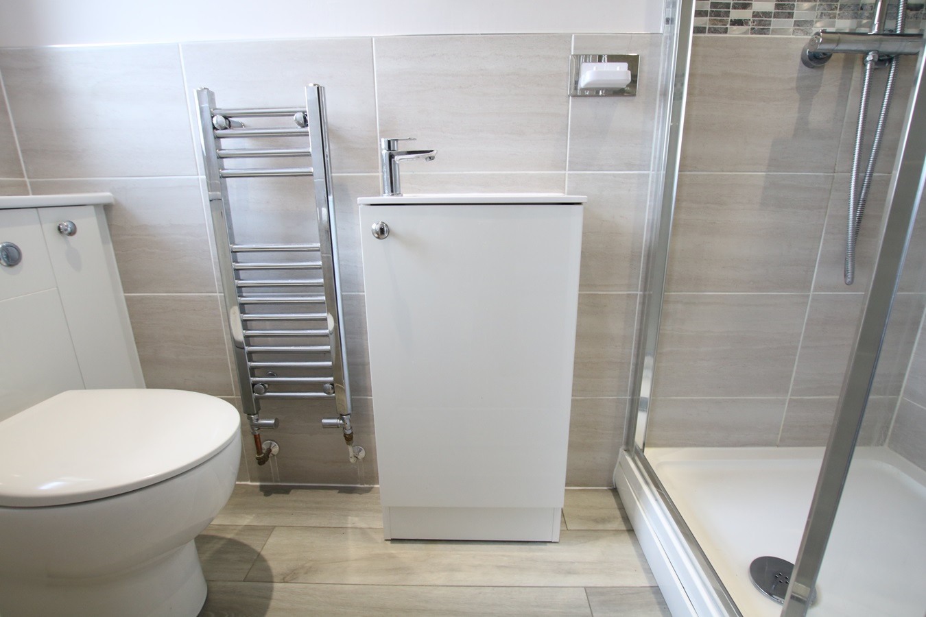 En-suite: Re-fitted contemporary suite comprises low level wc with concealed cistern, vanity unit with wash hand basin and mono mixer tap and large independent shower enclosure with glazed screen, extensive wall tiling, tiled floor, extractor fan, PVC double glazed window to the rear aspect.