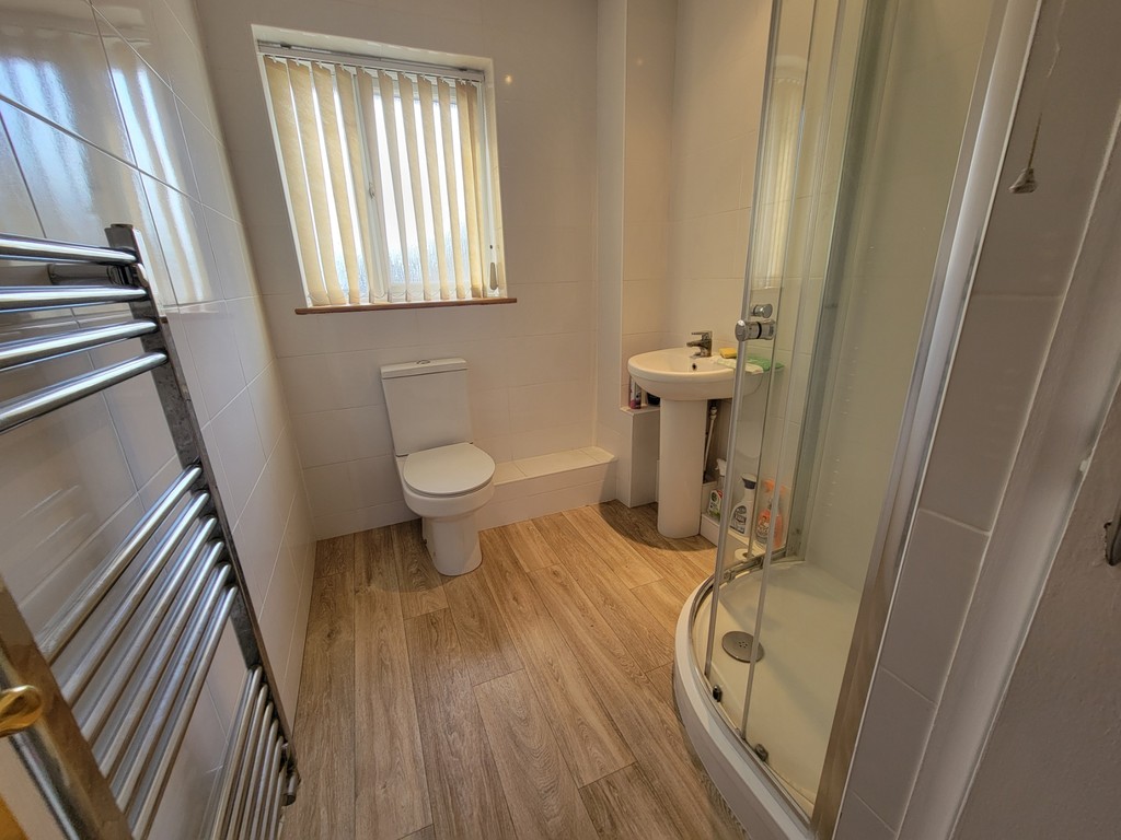 SHOWER ROOM: Modern white suite comprises low level wc, pedestal wash hand basin and thermostatic shower in tiled cubicle with sliding glazed screen, heated towel rail, PVC double glazed window to the front aspect.
