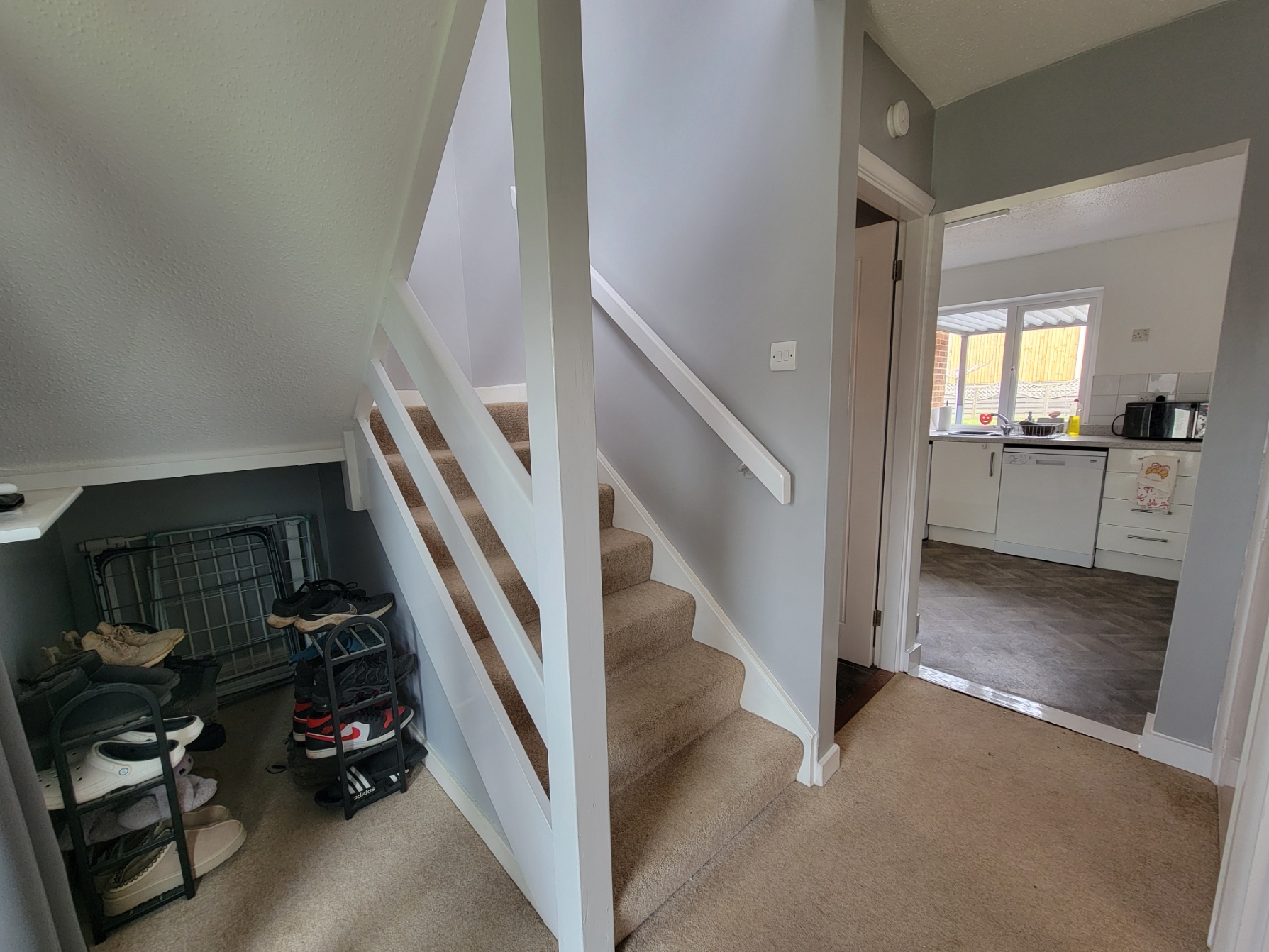 PVC double glazed entrance door, staircase to the first floor with understairs storage area, built-in cloaks cupboard.