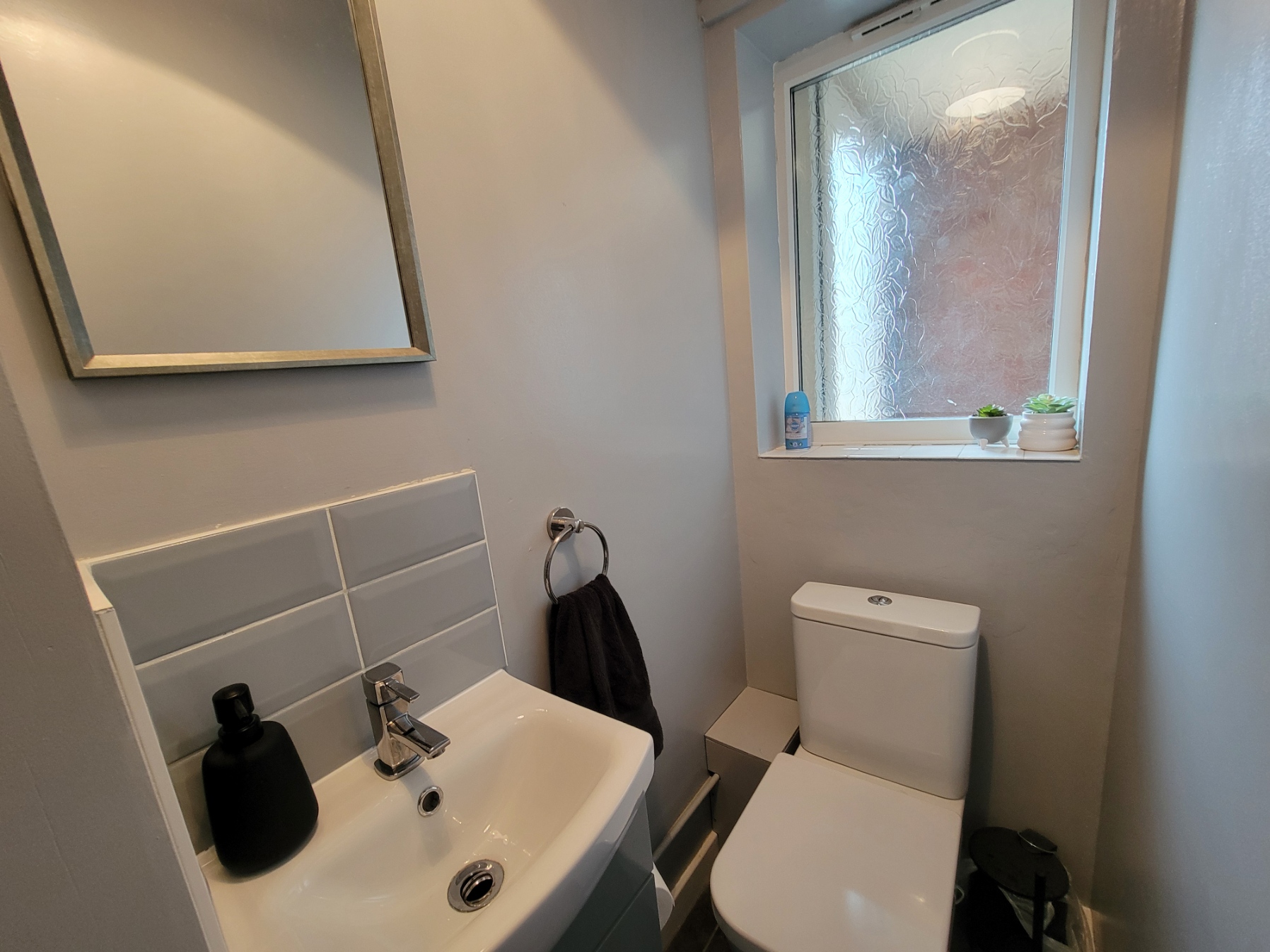 Recently re-fitted white suite comprises low level wc and wall mounted wash hand basin with mixer tap, PVC double glazed window to the side aspect.