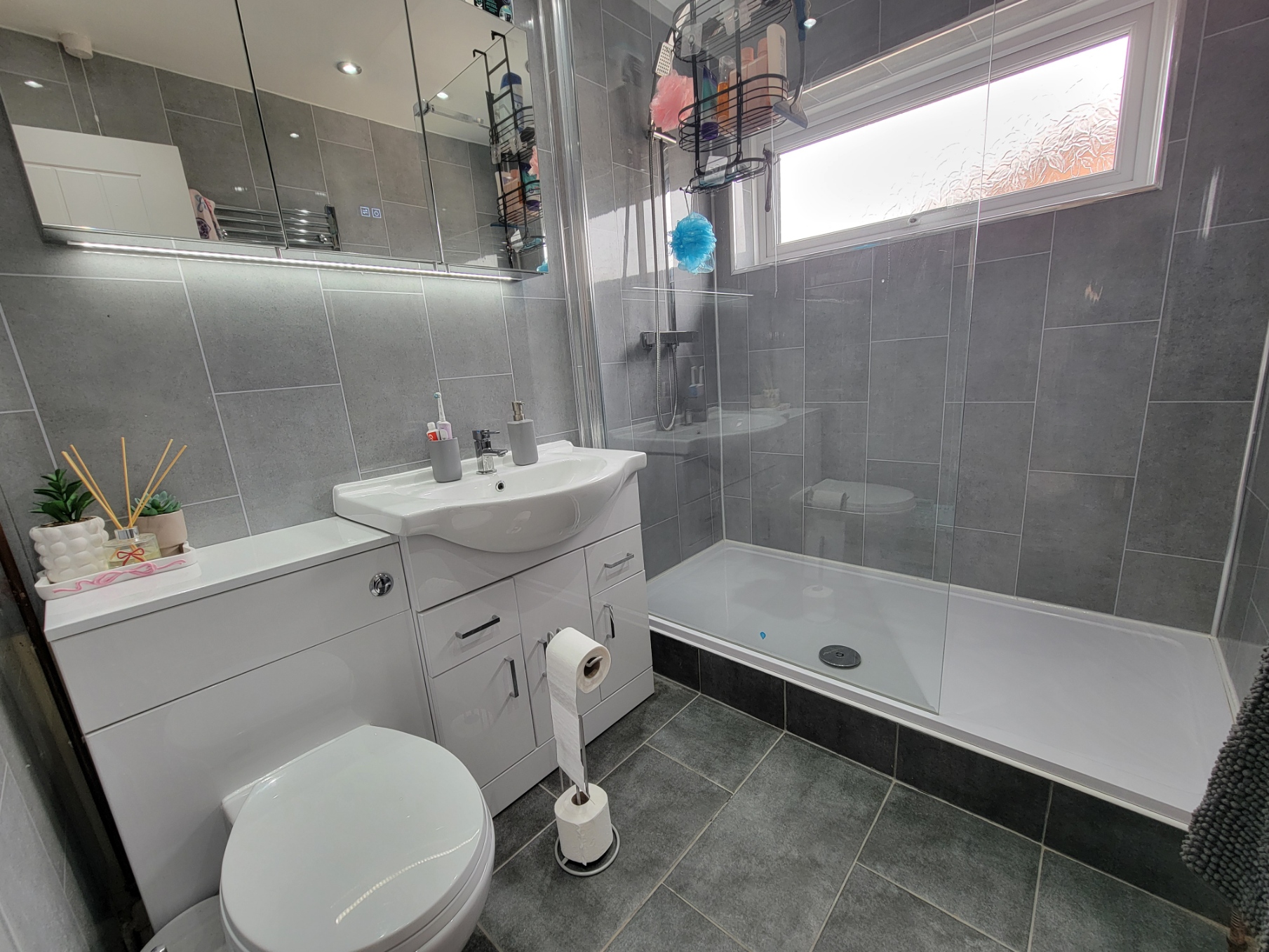 7' 5" x 5' 7" (2.26m x 1.7m) Recently re-fitted white suite comprises double shower enclosure with glazed screen and built-in vanity unit with low level wc with concealed cistern, inset wash hand basin with mixer tap and storage cupboards and drawers below, extensive wall tiling, PVC double glazed window to the side aspect.