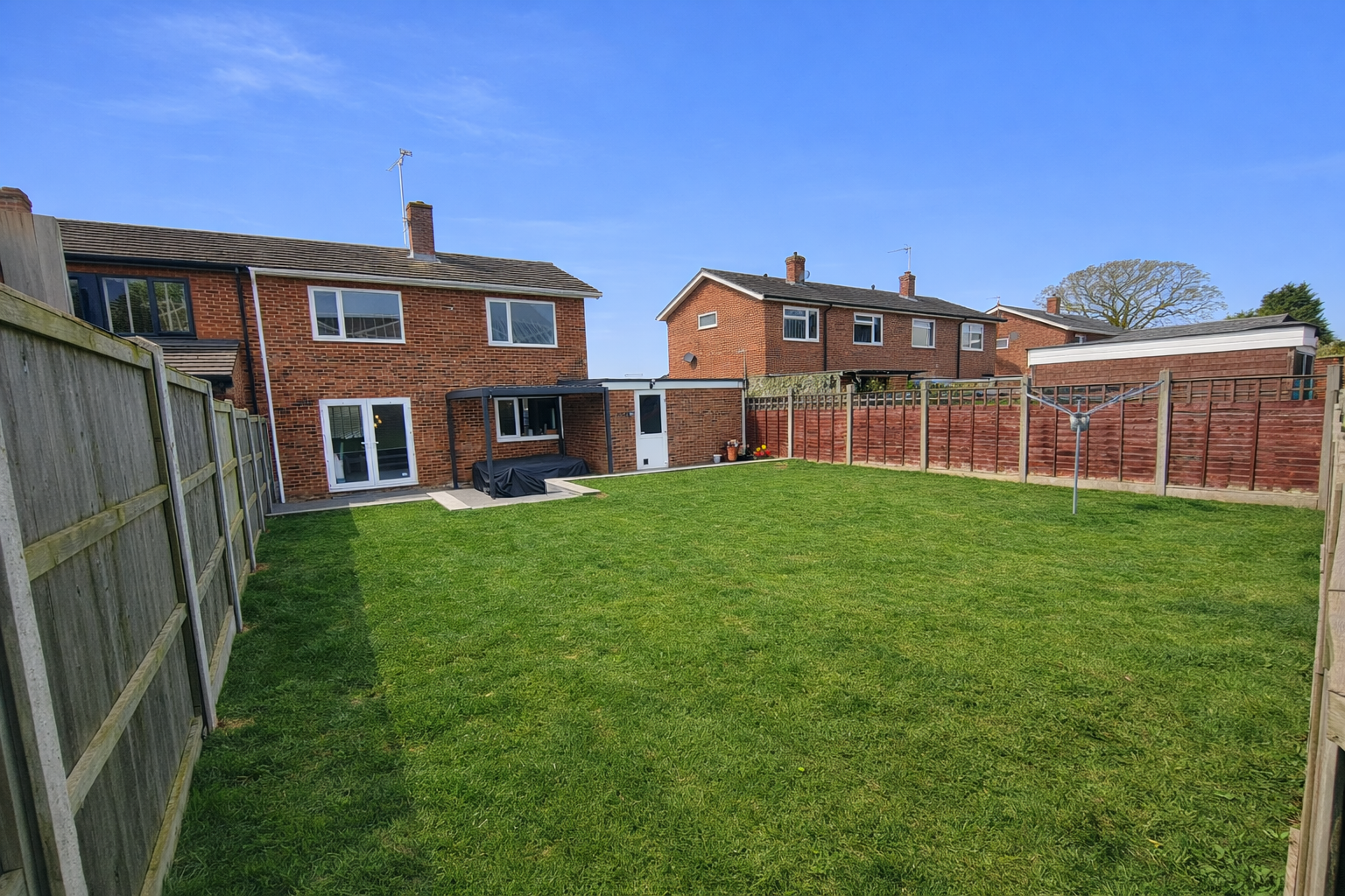 There is a good size open plan front garden with adjacent drive providing two off road parking spaces giving direct access to the garage 21'5" x 15' at the longest points, with up and over door, PVC double glazed door opens to the rear garden. The wide rear garden comprises a recently laid patio leading to a generous lawn with fenced boundaries.
