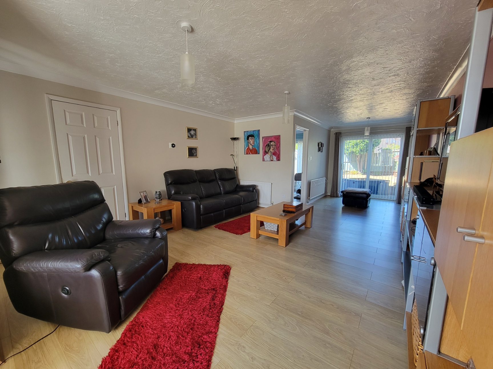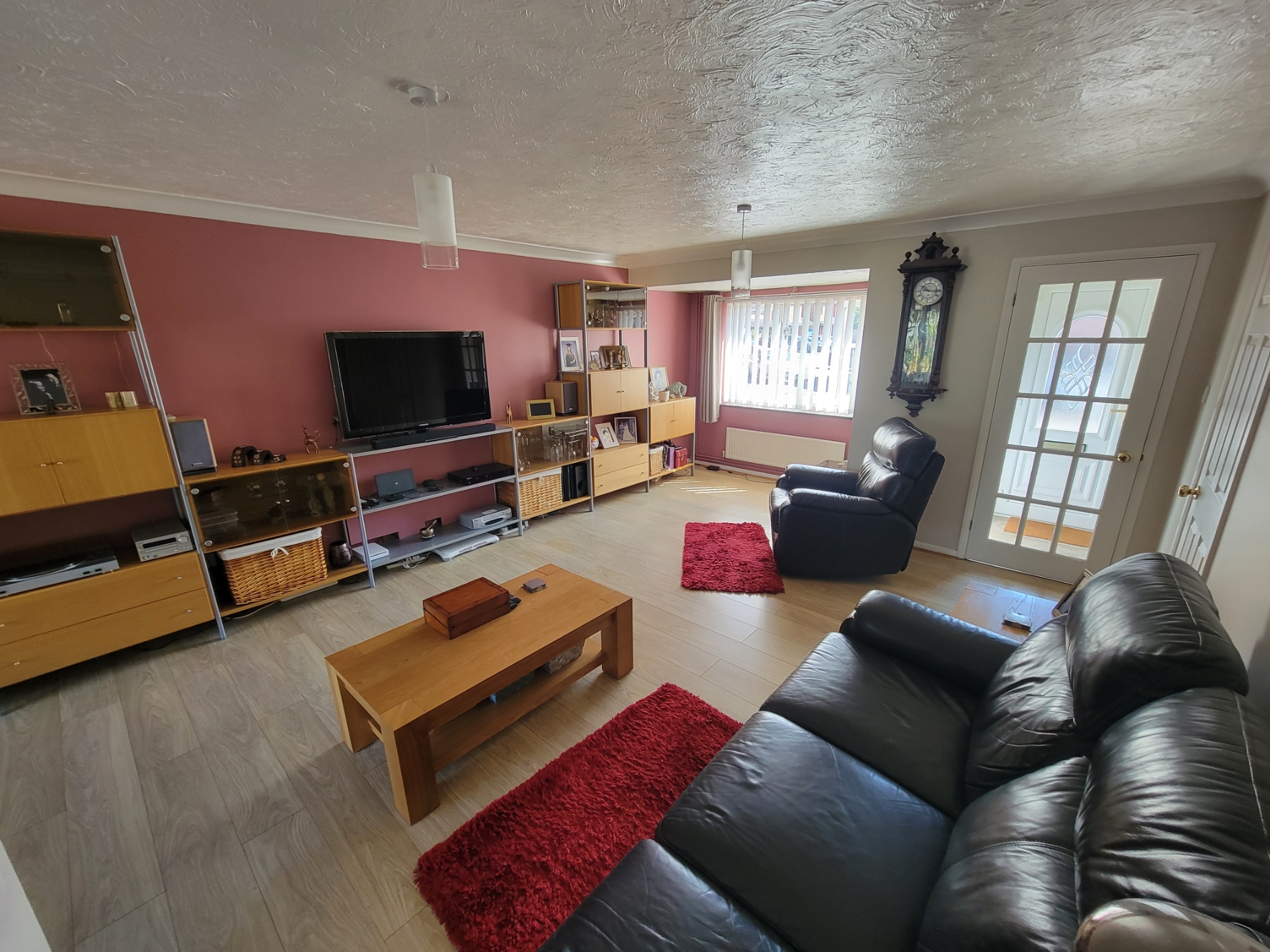 28' 5" x 13' 9" (8.66m x 4.19m) Three radiators, tv point, wood effect flooring, sliding patio doors opening to the garden, window to the front aspect.