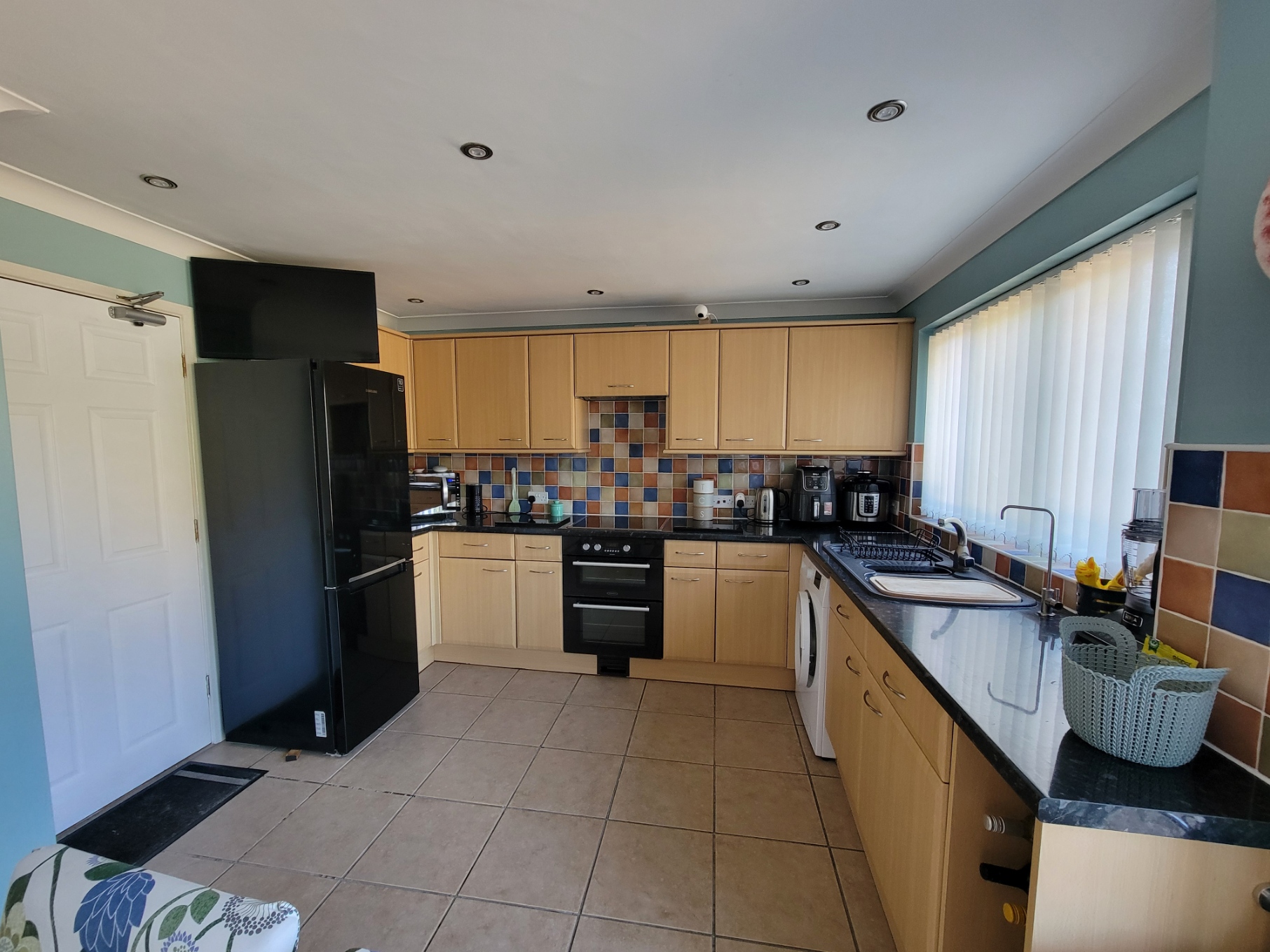 17' 4" x 11' 8" (5.28m x 3.56m) Fitted with a generous range of base and wall mounted units having wood effect doors and drawer fronts, fitted worktops inset with one and a half bowl sink unit with mixer tap, built-in black glass oven and grill with four ring hob above and extractor fan connected over, tiled splash backs, tiled flooring, plumbing and space for washing machine, space for fridge/freezer, spotlights, radiator, door to the garage/workshop, built-in understairs storage cupboard window and sliding patio doors opening to the rear garden.