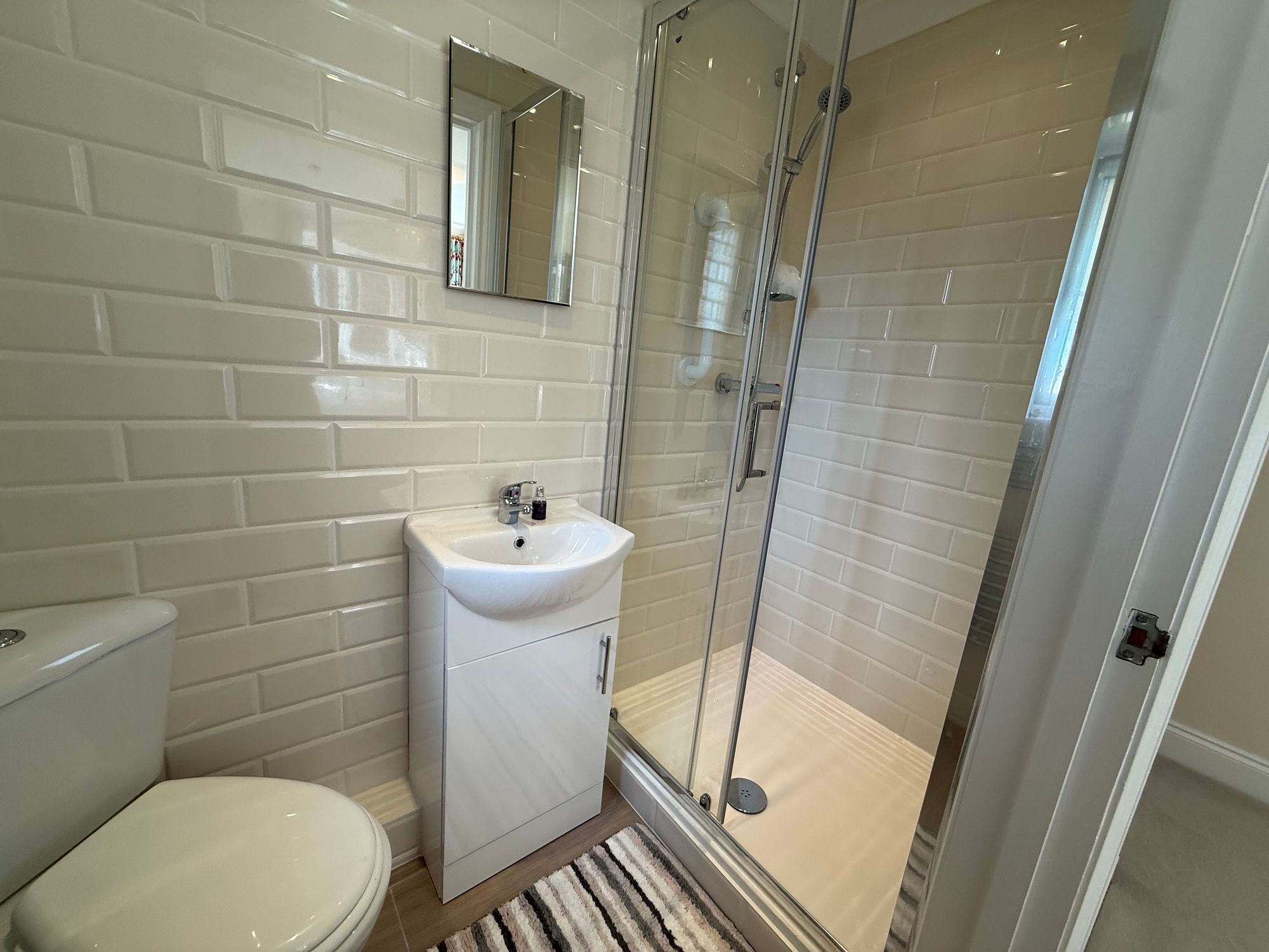The en suite shower room features a sliding door to a fully tiled cubicle with adjustable shower head, built-in corner WC, vanity unit with inset sink and cupboard beneath, heated chrome towel rail, extractor fan, and side window.
