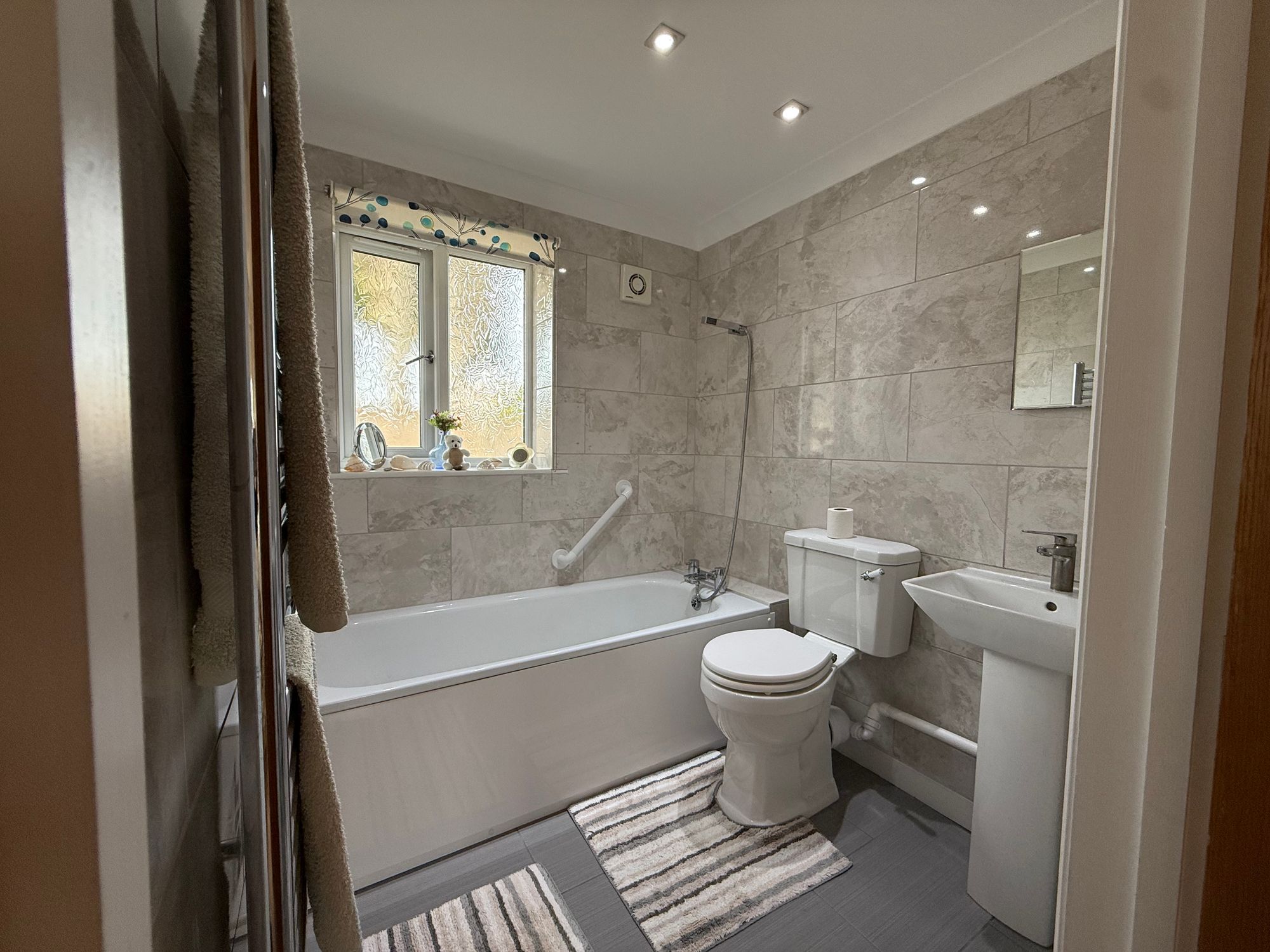 Finished with a panelled bath and shower attachment, WC, pedestal wash basin, heated towel rail, extractor fan, and rear-facing window.
