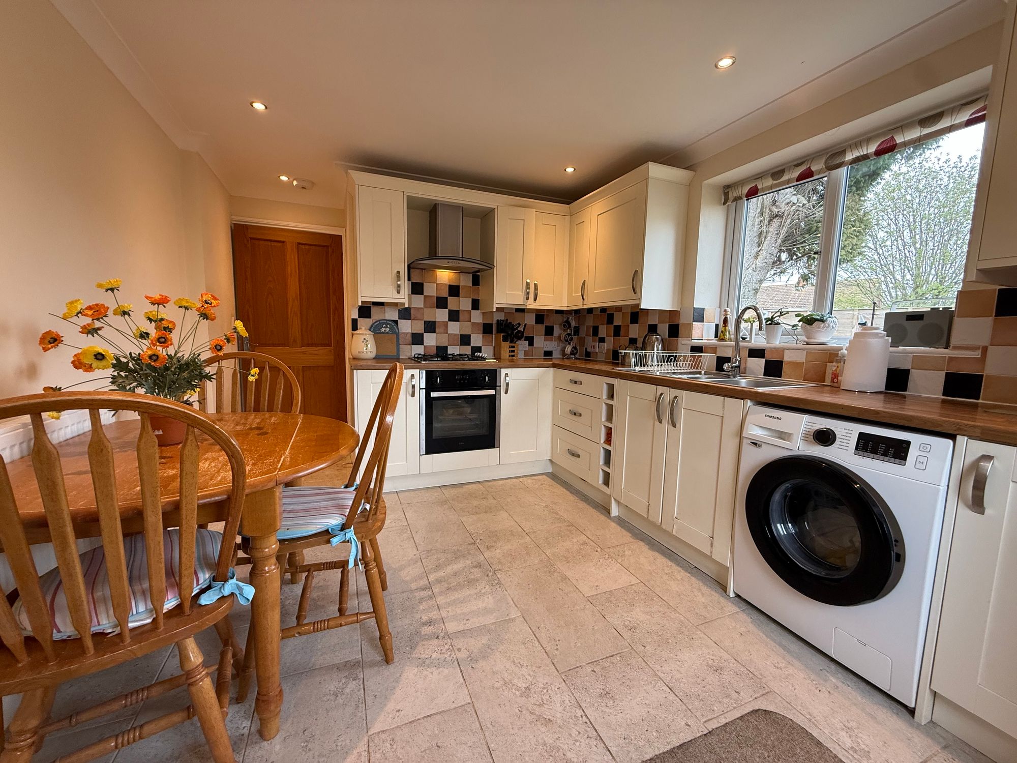 A superb open-plan space fitted with a range of upper and lower cabinets, drawers, and a built-in wine rack. The kitchen includes a gas hob with electric oven below, stainless steel extractor hood, and space and plumbing for a washing machine. The gas-fired boiler is neatly concealed within a wall-mounted cupboard. Recessed ceiling spotlights provide modern lighting, while a half-glazed door opens to the rear garden and driveway, ensuring excellent natural light and access for entertaining.