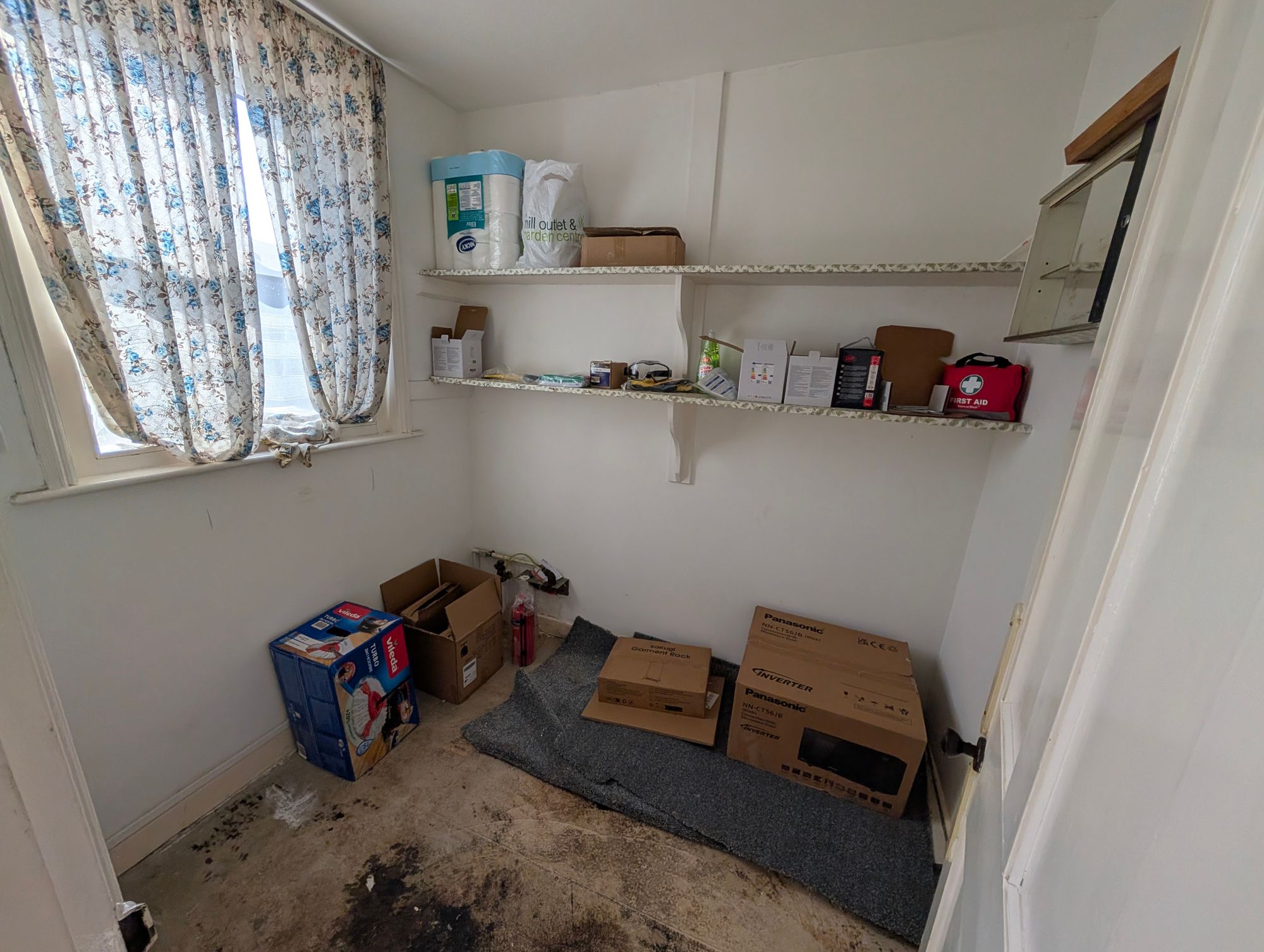 Walk-in pantry with fitted shelving and double-glazed window to the rear.
