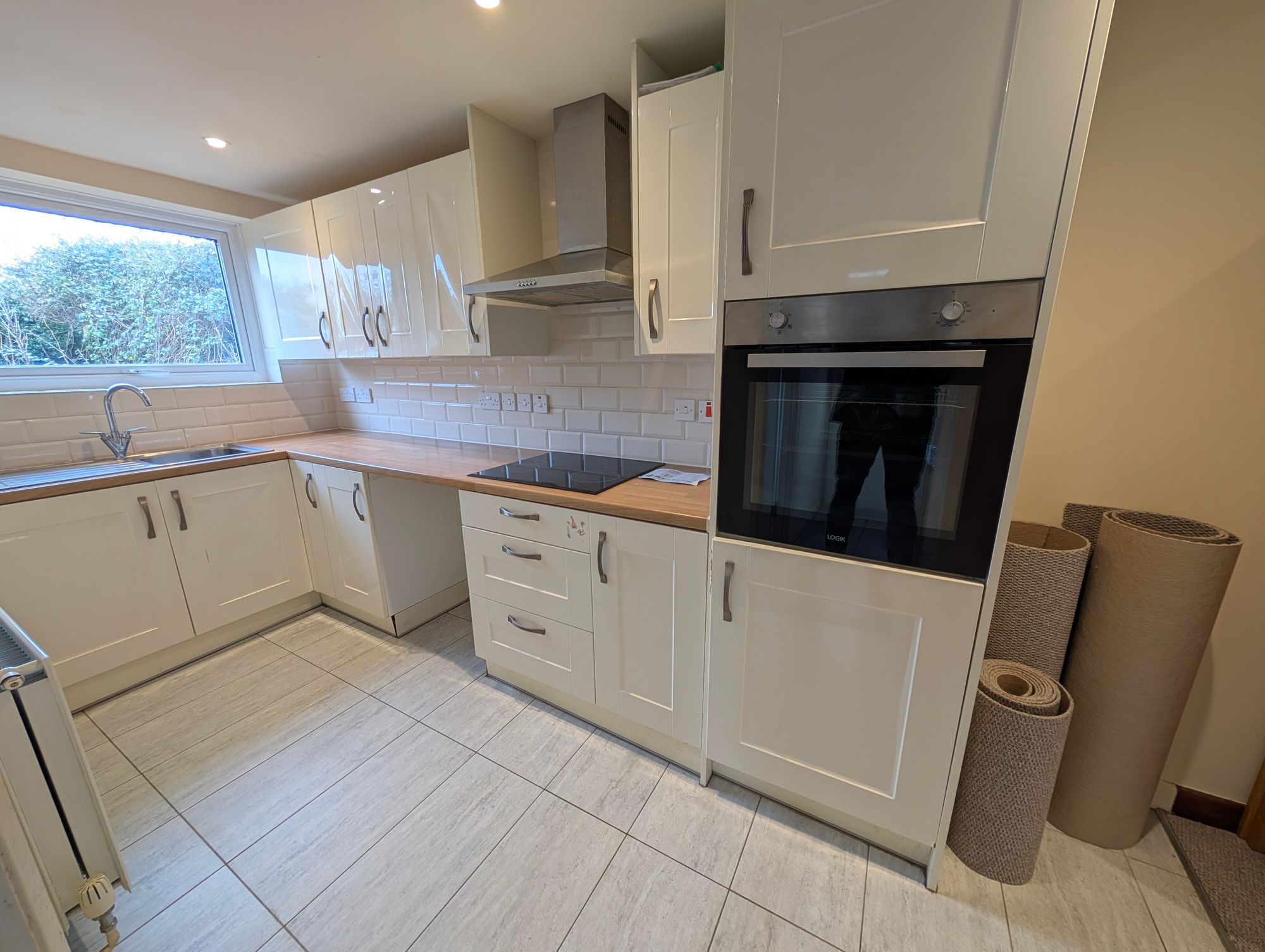 Dimensions: 11' 1" x 5' 9" (3.40m x 1.76m). Window to the rear. Radiator, tiled floor. High and low level units with roll edge work surface and single drain sink. Tiled splash backs. Integrated electric oven hob and extractor fan. Space for washing machine and tall fridge freezer.