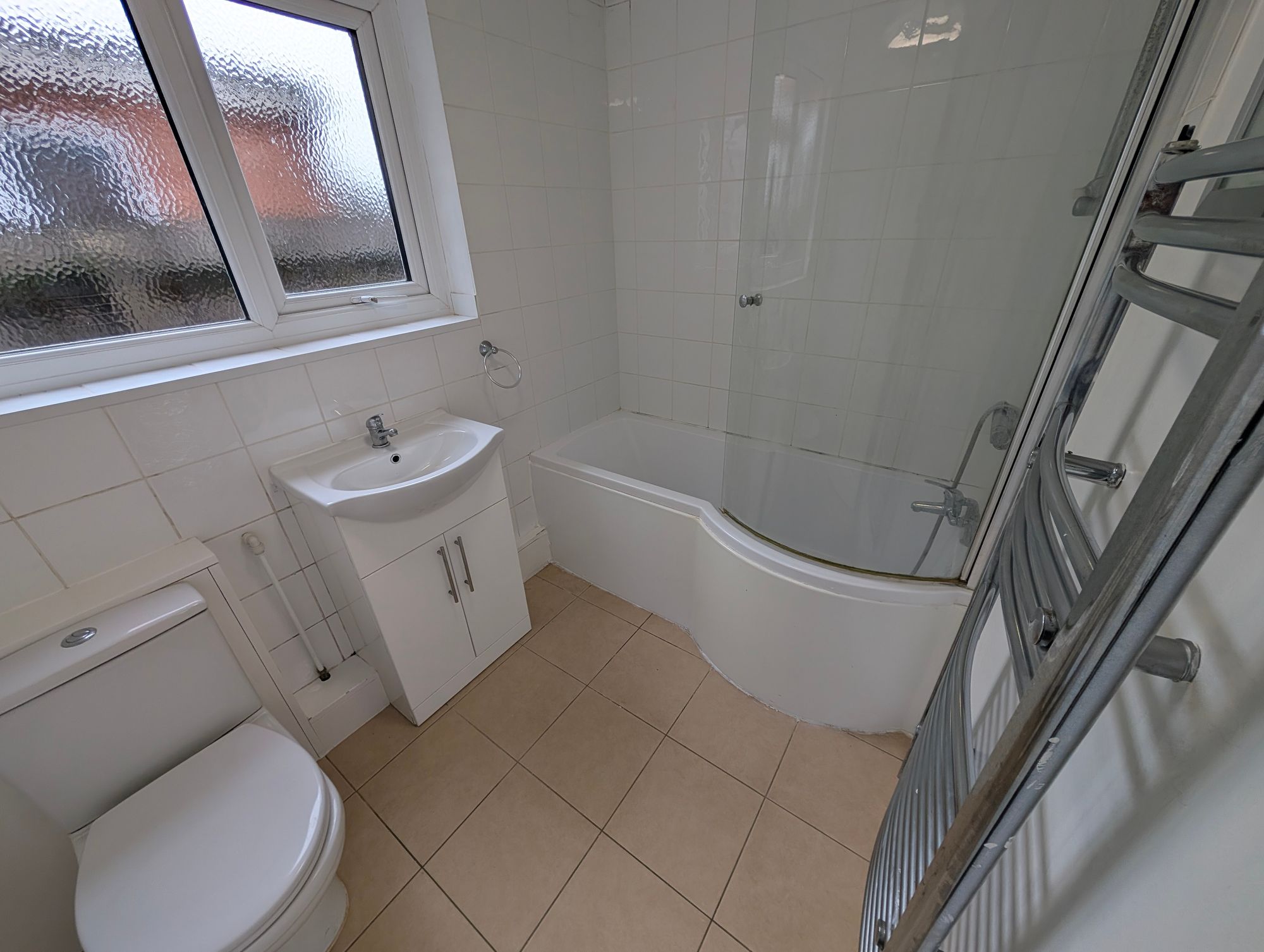 Window to the side, full white suite including a "P" shaped bath with shower over.