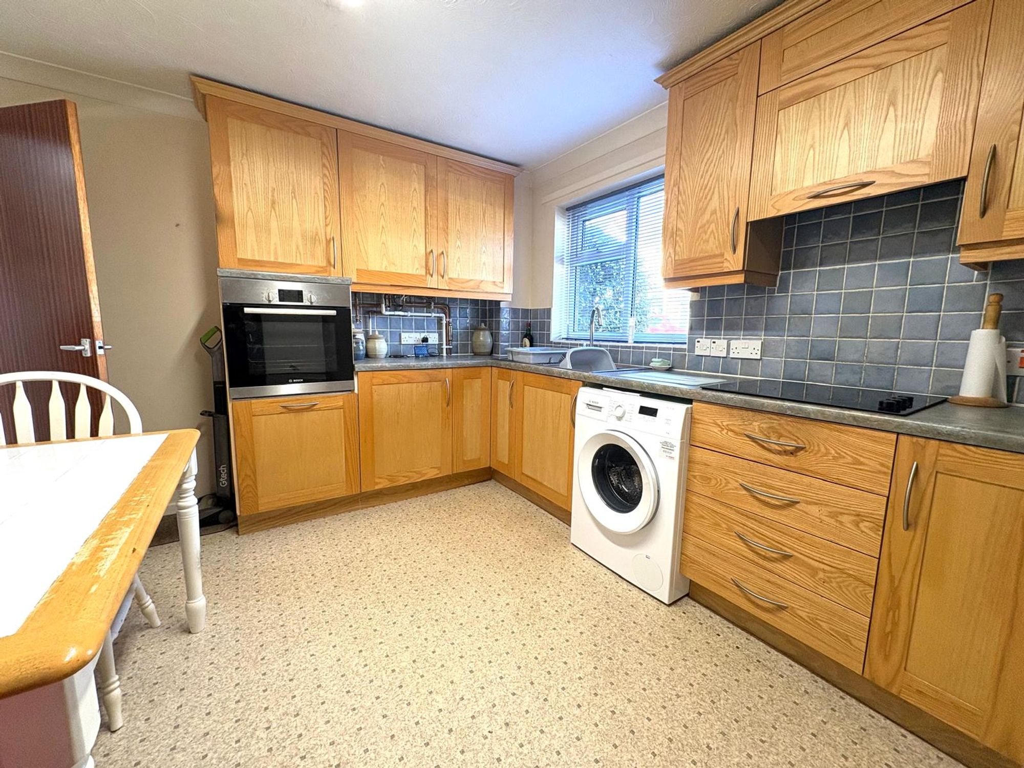 Fitted with a range of beech-fronted base and wall units with roll-edge worktops. Inset stainless steel sink with mixer tap and tiled splashbacks. Built-in electric oven with four-ring electric hob and extractor hood above.