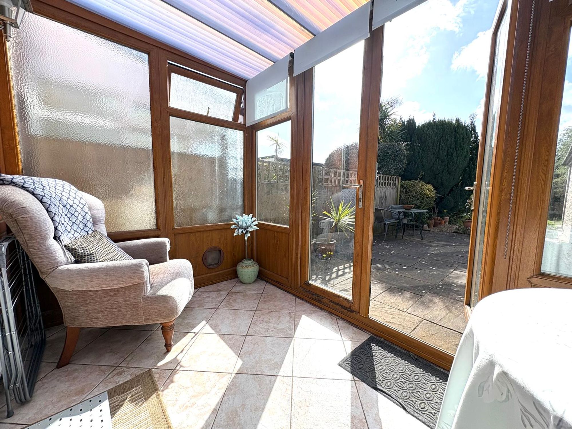uPVC construction with polycarbonate roof, tiled flooring and power points. Patio doors open onto the south-facing rear garden.