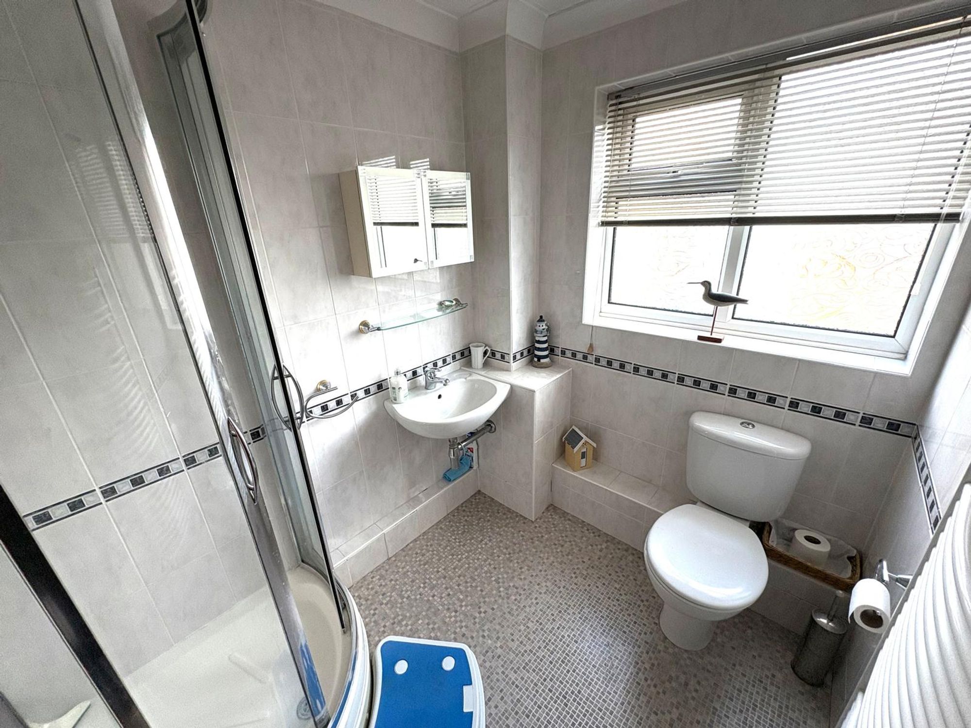 Corner shower cubicle with Triton electric shower, wall-mounted wash hand basin and low-level WC. UPVC window to the front aspect, chrome heated towel rail and extractor fan.