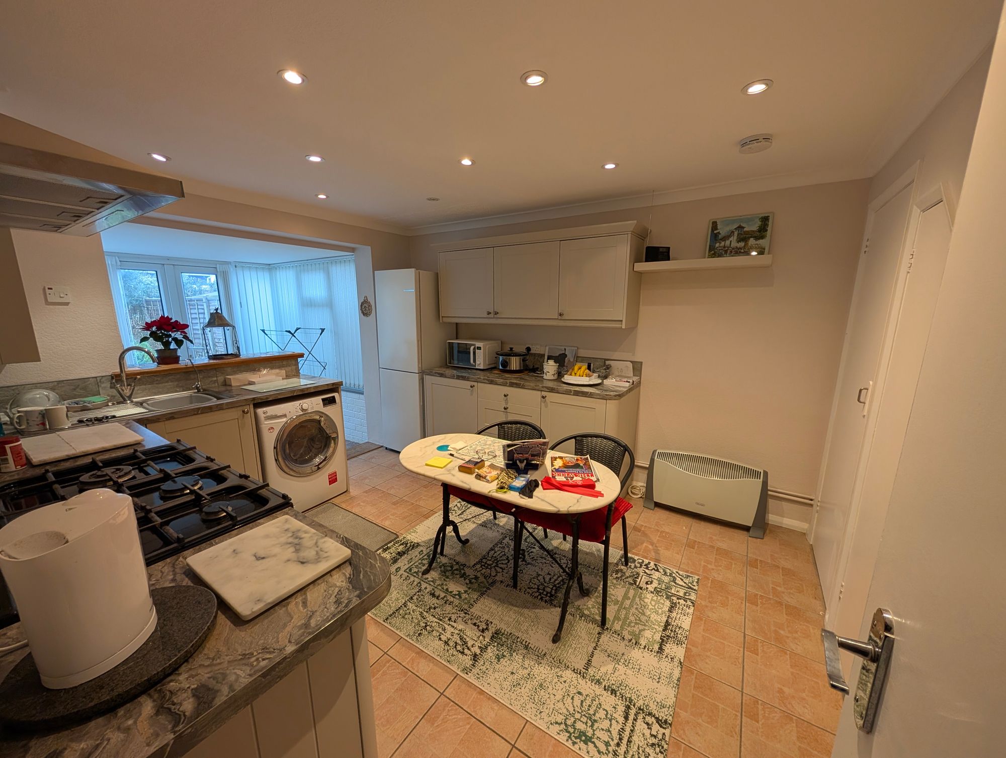 Brand new fitted kitchen with marble-effect work surfaces. Range-style oven, space for dishwasher, washing machine and tall fridge freezer. Wall-mounted gas combi boiler housed within a cabinet and useful understairs storage.