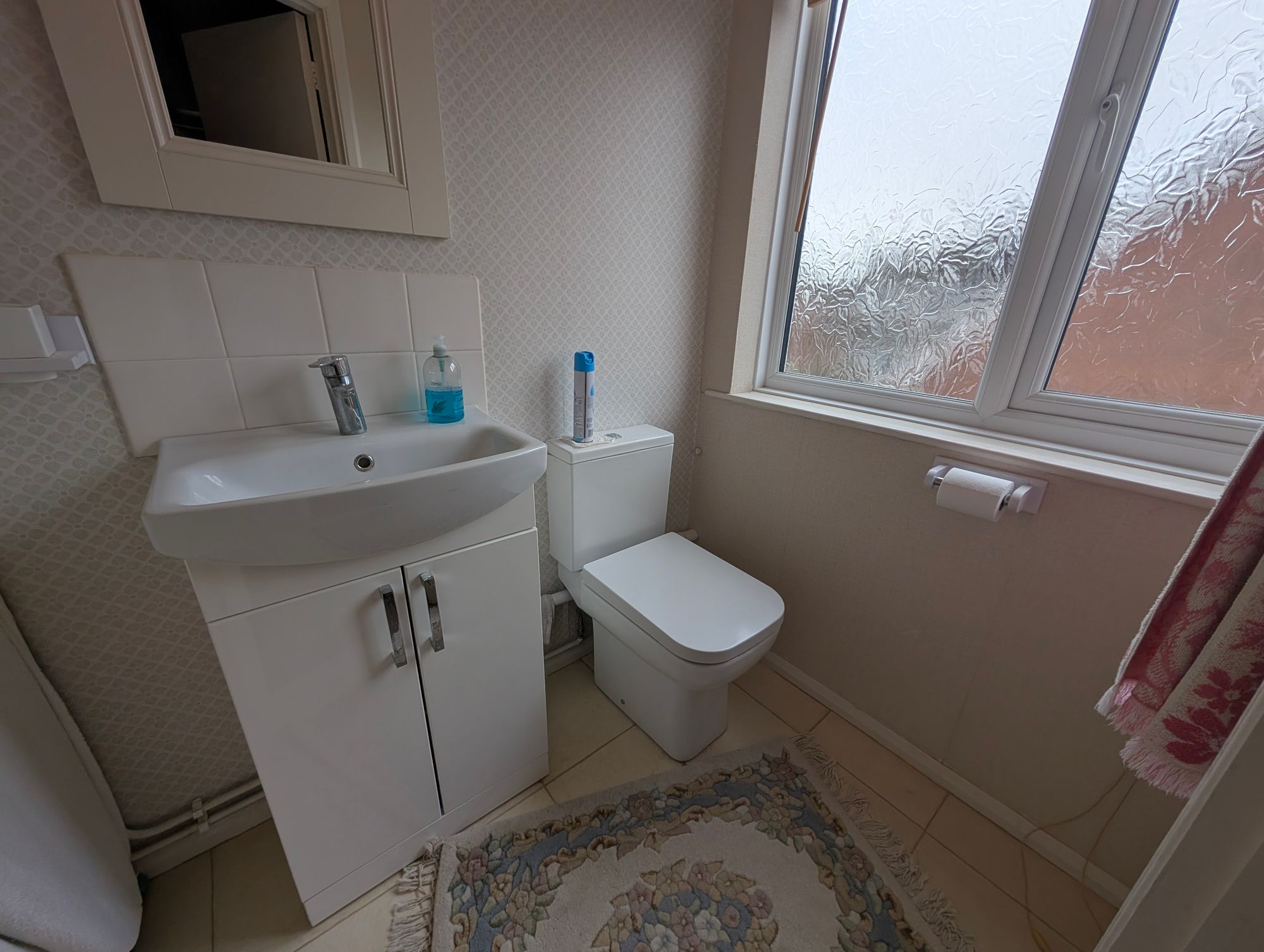 Window to rear, corner shower cubicle with electric shower, WC and wash hand basin with storage below. Fully tiled walls and floor.