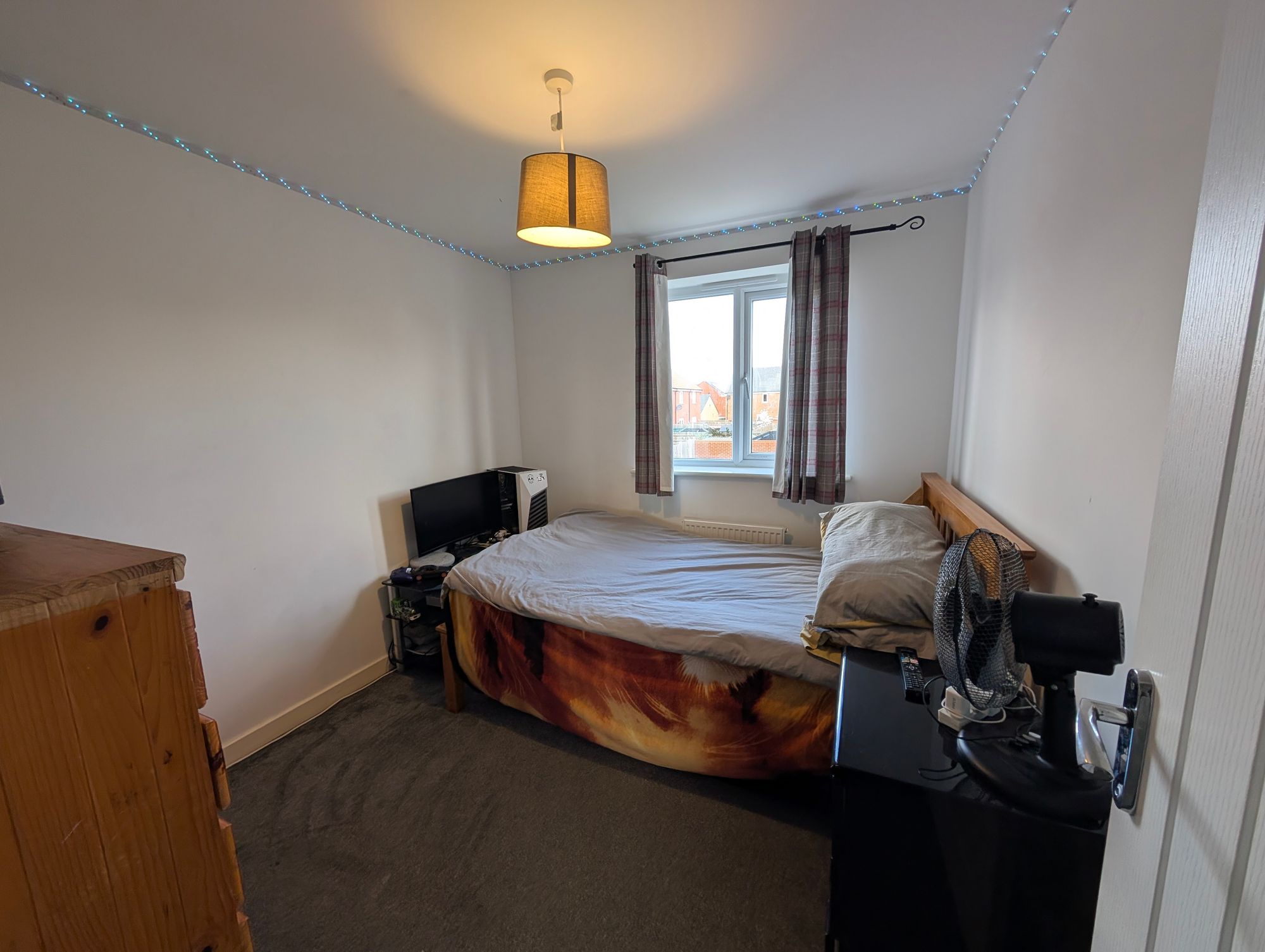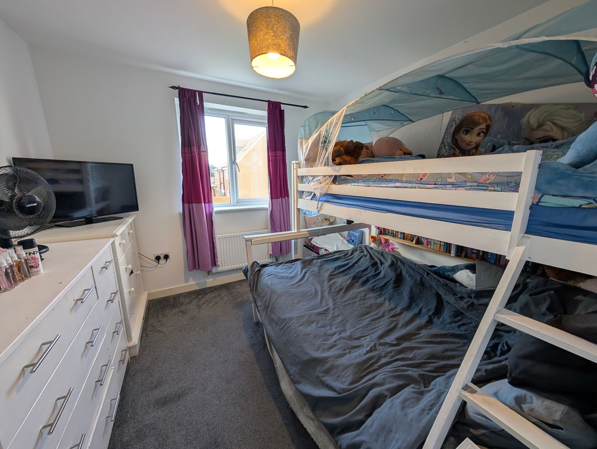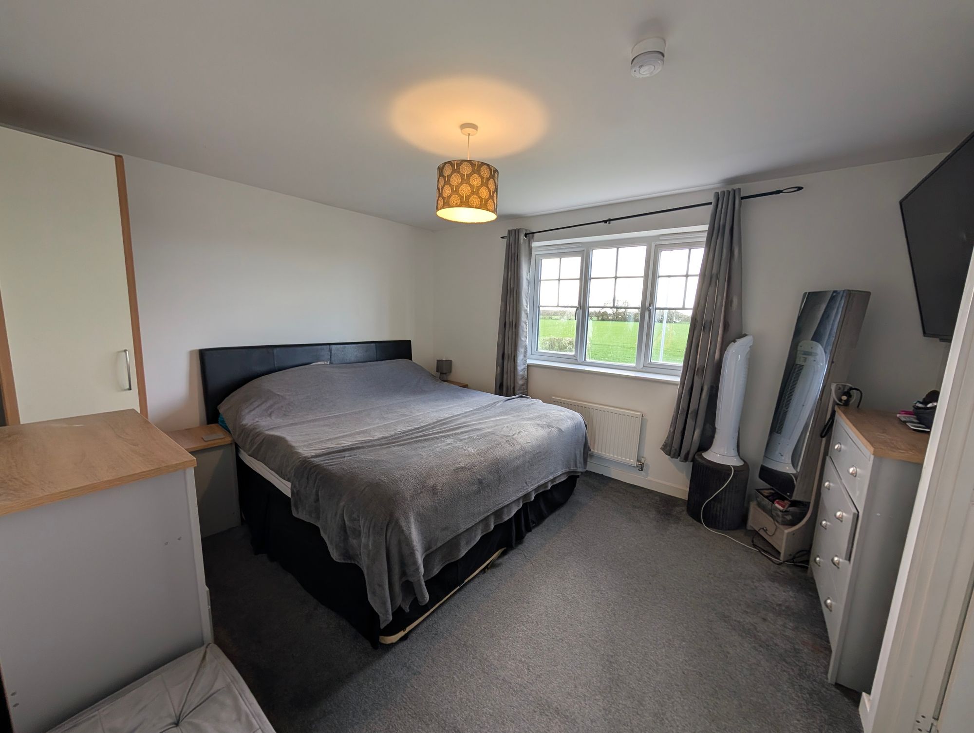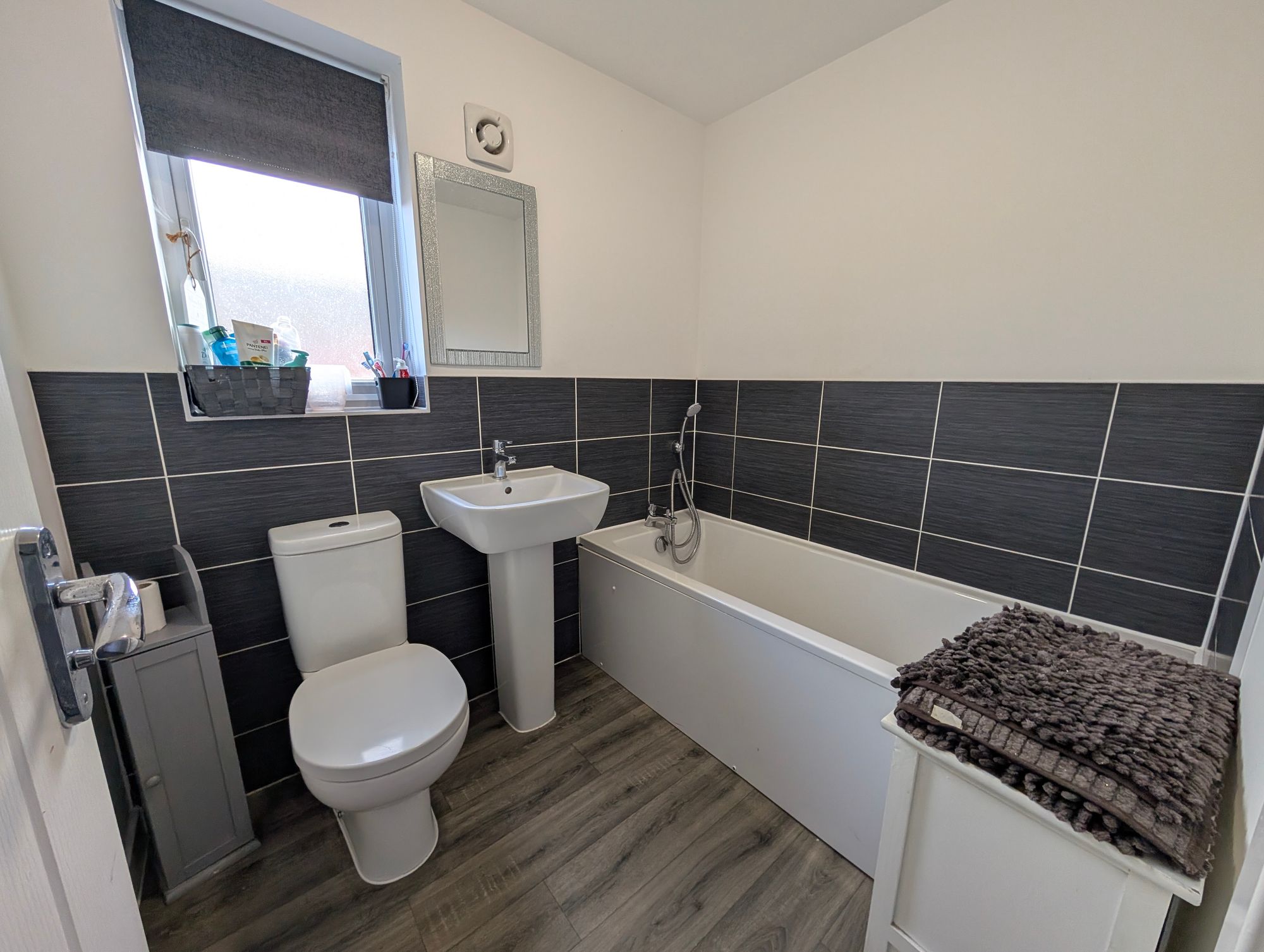 There are two further bedrooms, both of which can accommodate double beds, with windows to the rear and radiators. The family bathroom is fitted with a panel bath with shower over, WC, and pedestal wash hand basin, complemented by partially tiled walls, radiator, and a side aspect window.