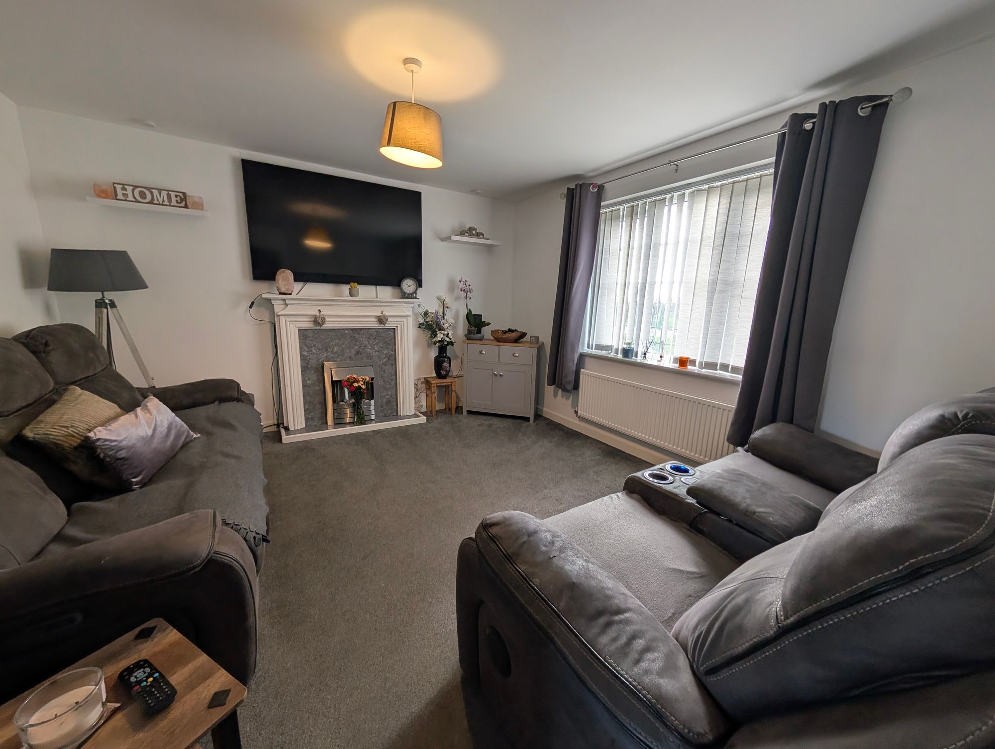 The sitting room is positioned to the front of the property and features a window with fitted blind, radiator, and an electric fireplace with wooden mantel (please note the fireplace is not included in the sale).