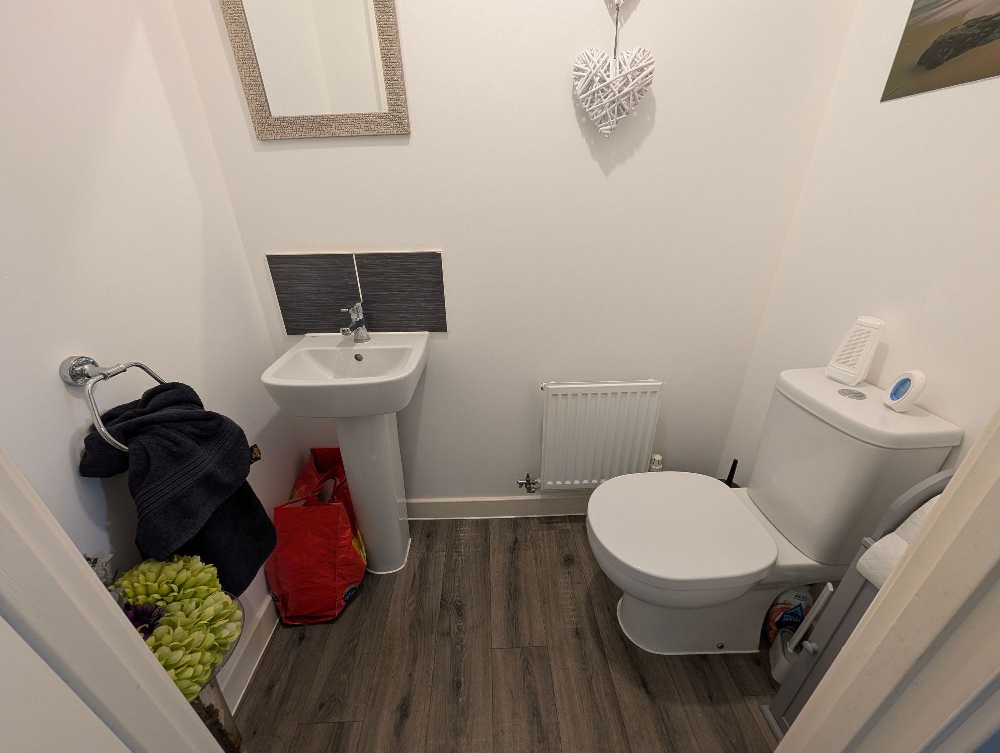 The property is entered via a glazed uPVC door into a welcoming inner hallway with radiator, stairs rising to the first floor, and a useful understairs storage cupboard. A cloakroom is fitted with a WC, wash hand basin, radiator, and extractor fan.